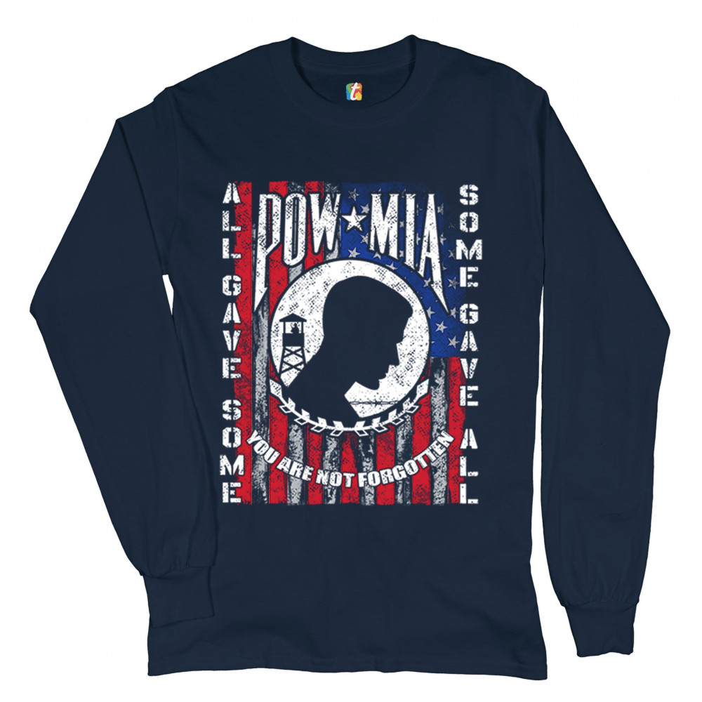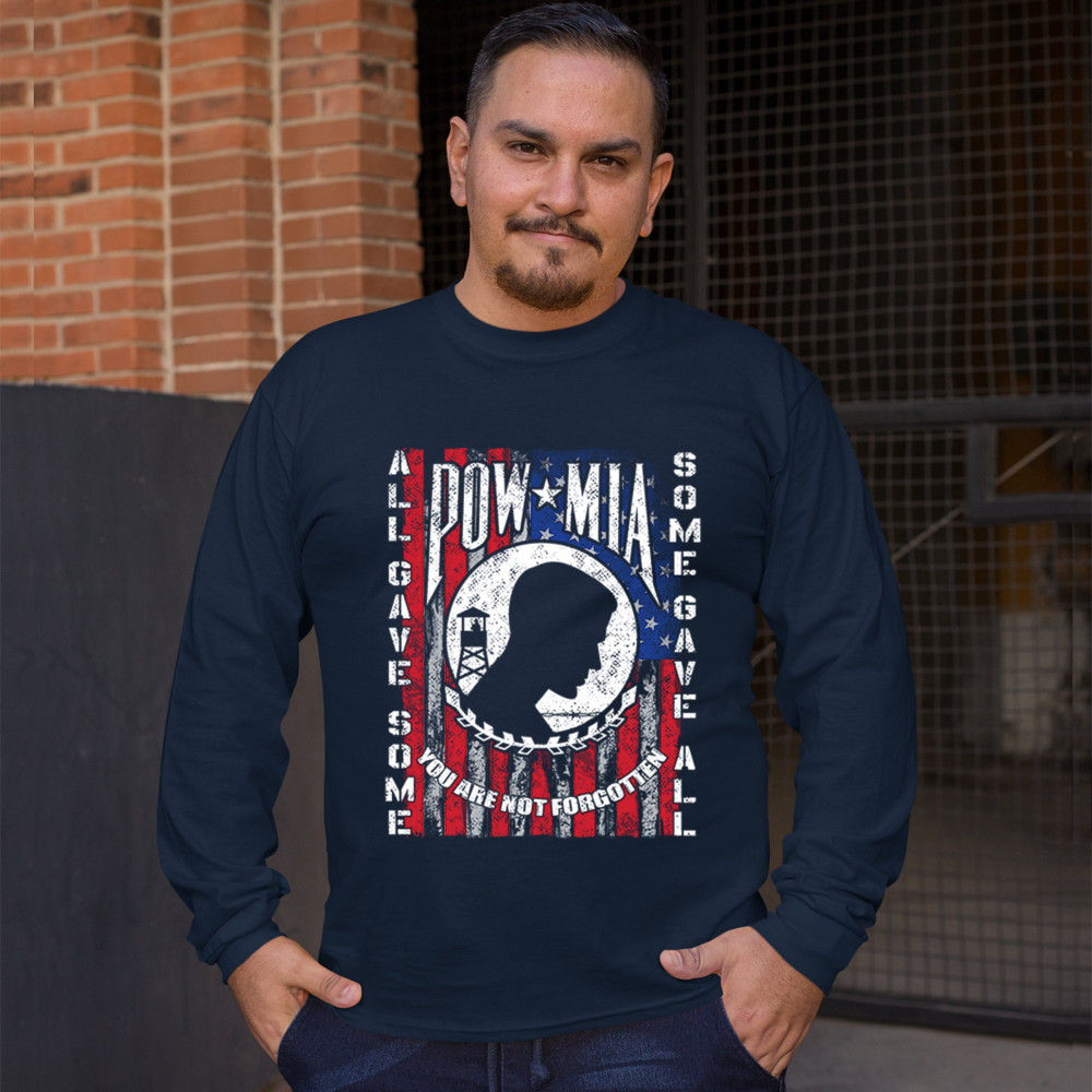 A patriotic print featuring the combination of the National League of Families' POW/MIA flag with a distressed American flag. On the sides of the flag it features the phrase: "All Gave Some, Some Gave All". Great choice to wear on Patriot's Day, Memorial