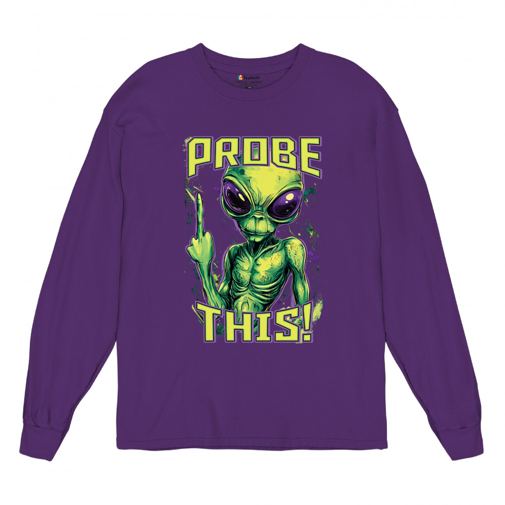 Alien attitude goes full throttle in this rebellious design featuring a defiant extraterrestrial flipping the bird. Bold green and purple tones amplify the sarcasm, making it perfect for UFO fans, protest vibes, and anyone with a dark sense of humor. Wear it loud to alien fests, parties, or anytime you want to stir the stars.