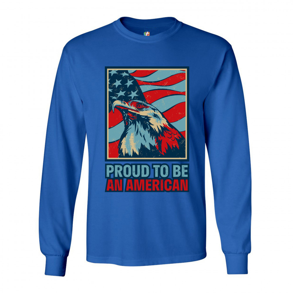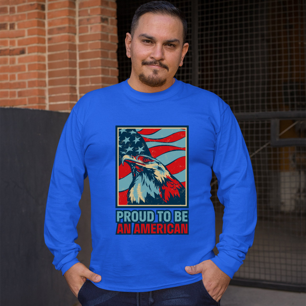 PROUD TO BE AN AMERICAN long sleeve t-shirt 4th of july bald eagle patriotic royal blue