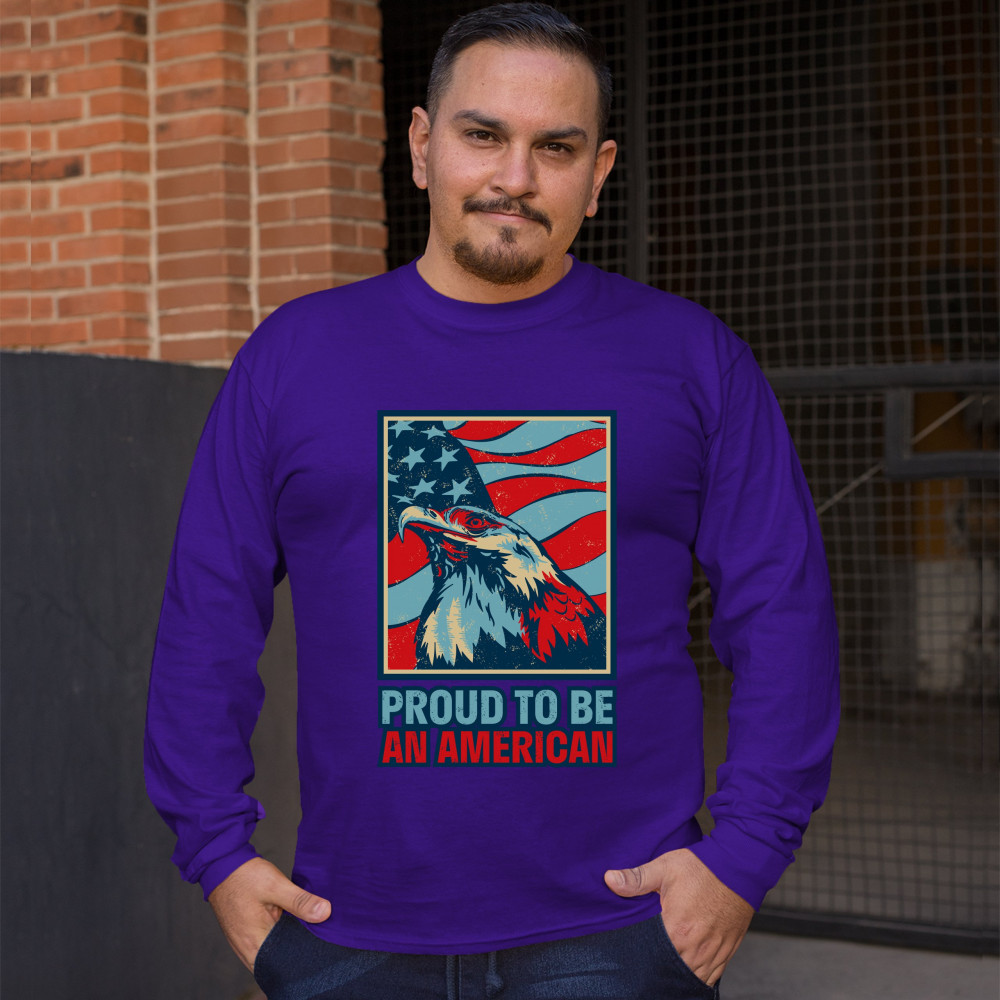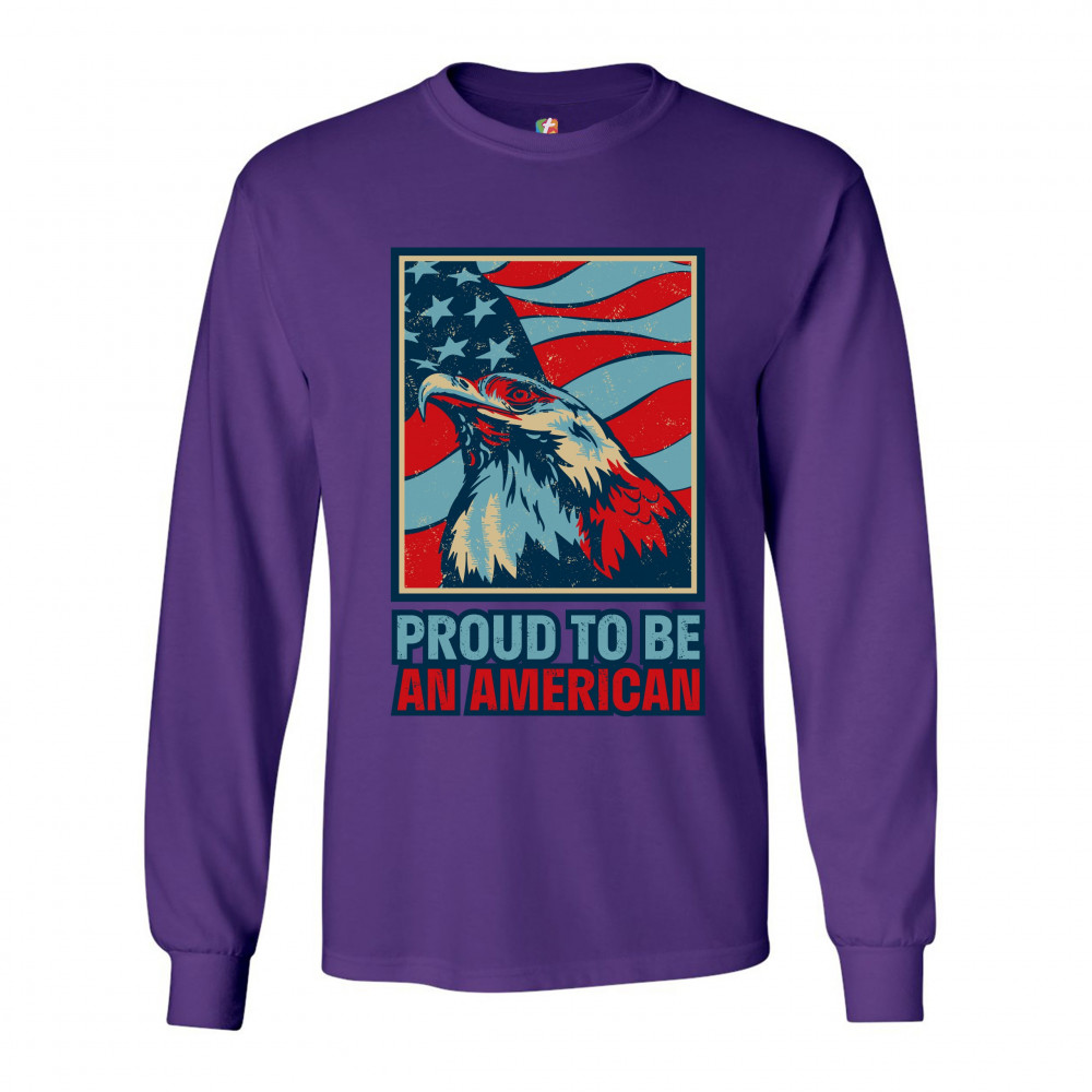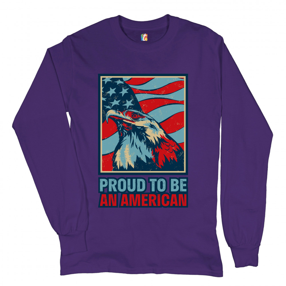PROUD TO BE AN AMERICAN long sleeve t-shirt 4th of july bald eagle patriotic purple