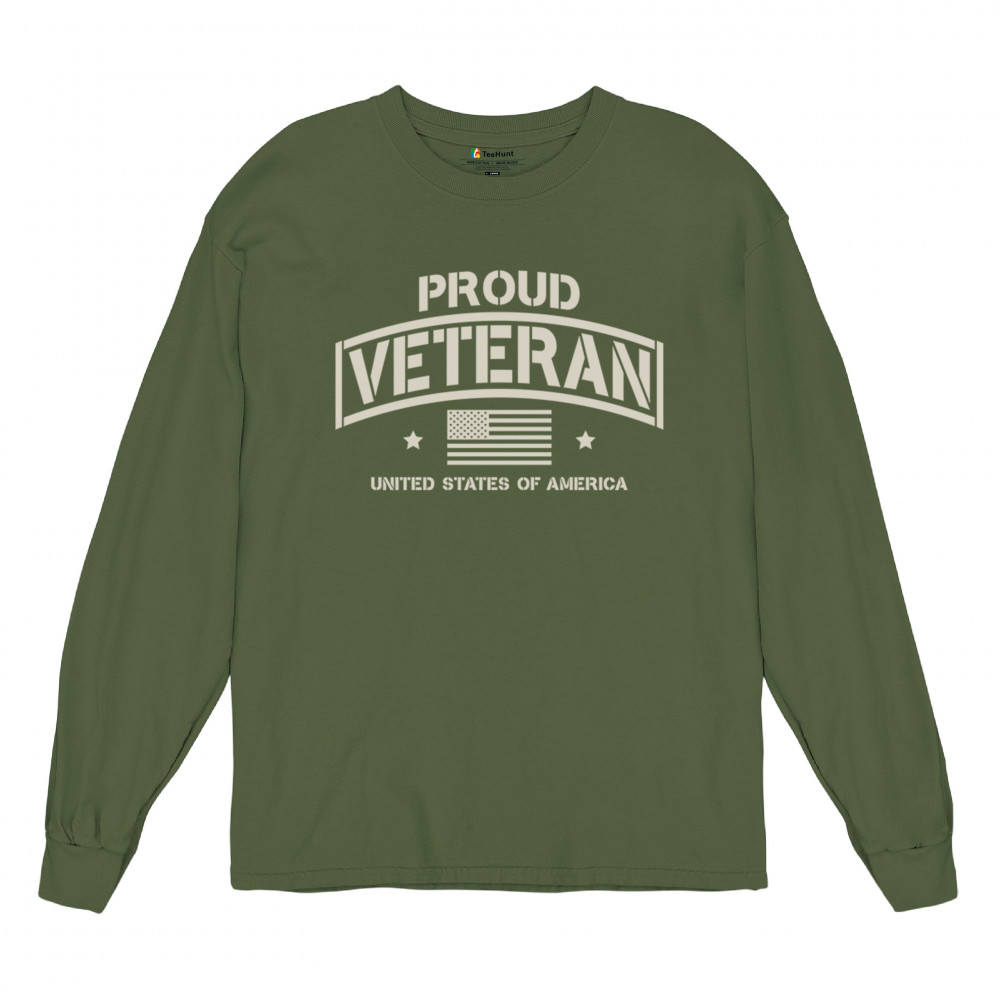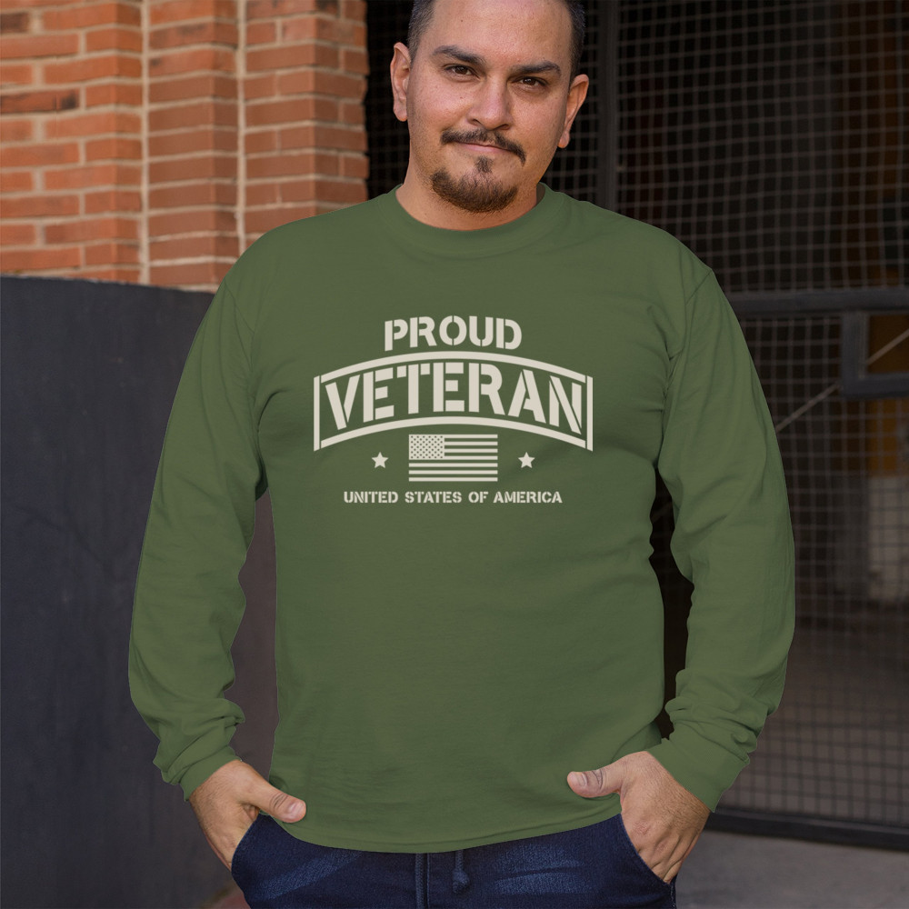 "Proud Veteran" shirt featuring bold design and American flag. Perfect for Memorial Day, Veterans Day, and everyday patriotism. High-quality and comfortable.