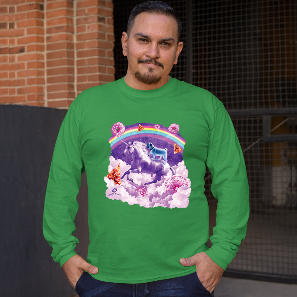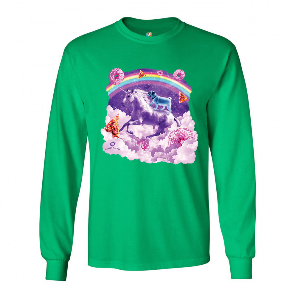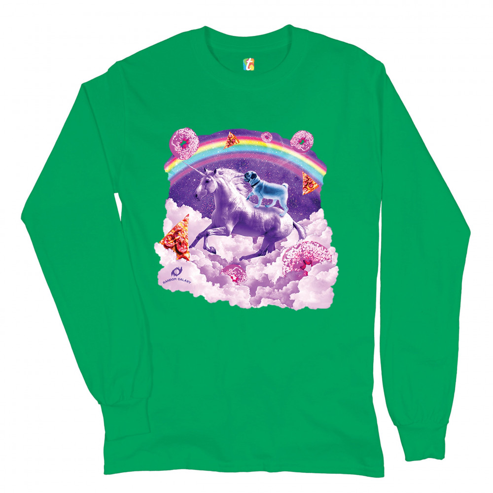 A beautiful print featuring a pug standing on a back of a unicorn galloping through clouds. In the background a rainbow crossing the space is seen. Across the clouds numerous pizza slices and donuts are scattered. A great choice for a person who loves pug