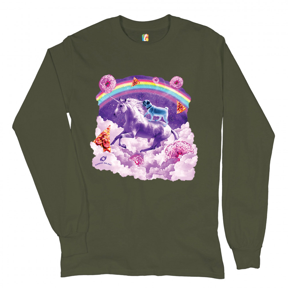 PUG RIDING A UNICORN IN CLOUDS long sleeve t-shirt space rainbow trippy donuts military green