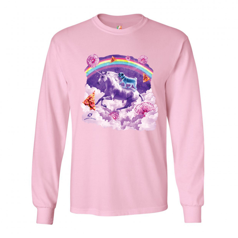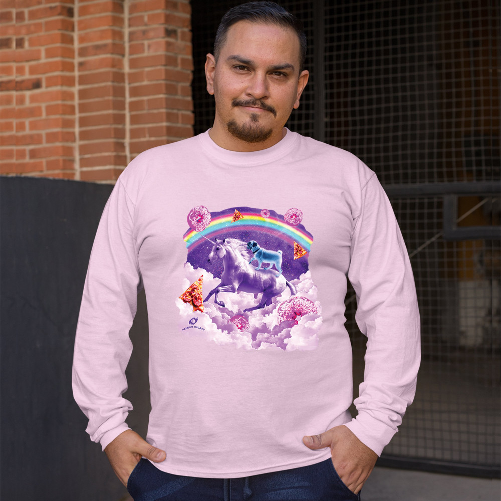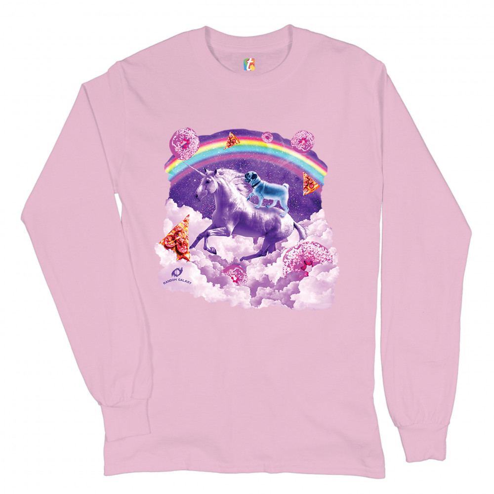 A beautiful print featuring a pug standing on a back of a unicorn galloping through clouds. In the background a rainbow crossing the space is seen. Across the clouds numerous pizza slices and donuts are scattered. A great choice for a person who loves pug