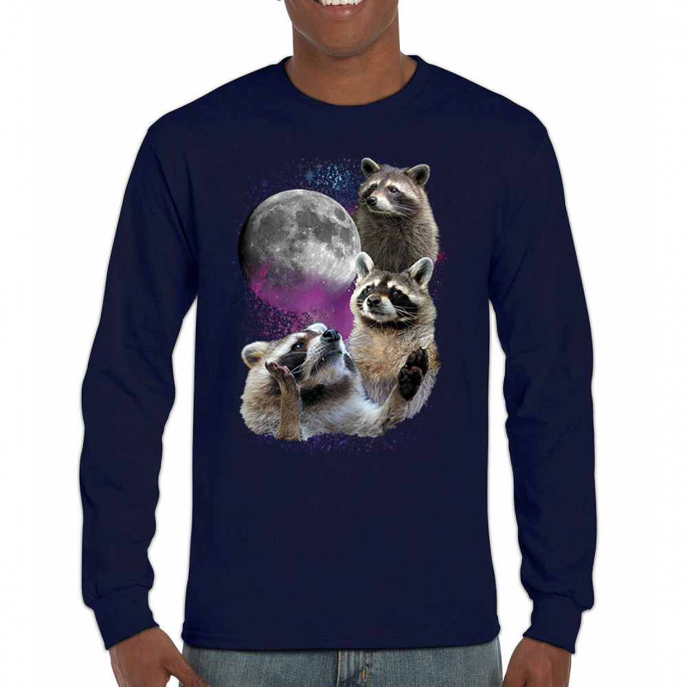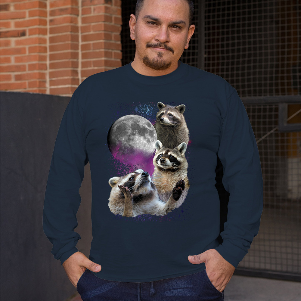 Embrace nature with this quirky raccoon and moon design, perfect for space and animal lovers. Ideal for casual wear or gifts.