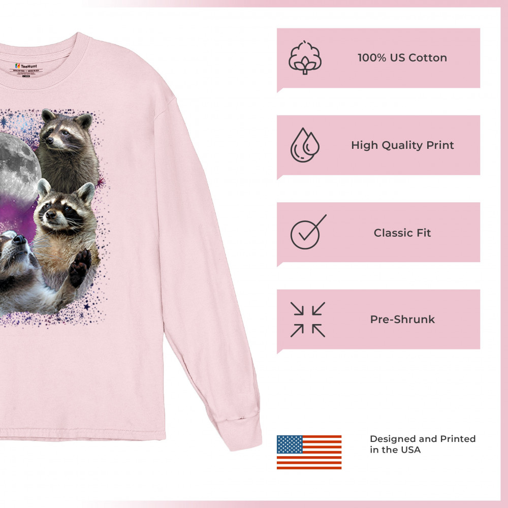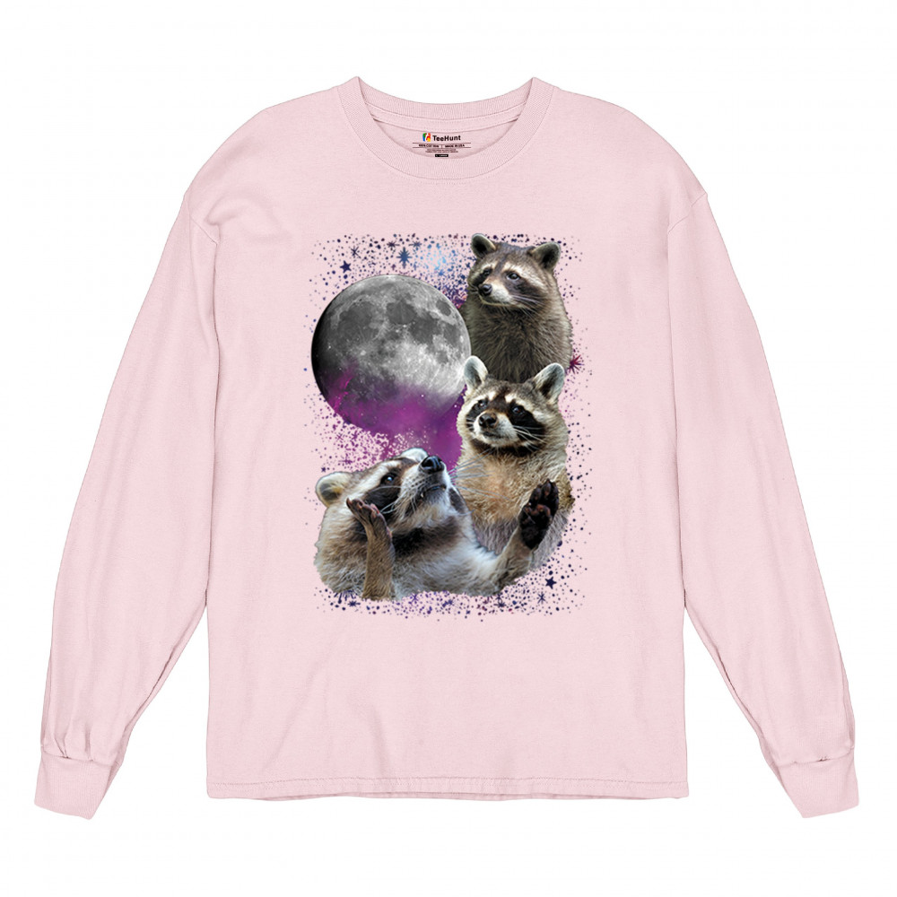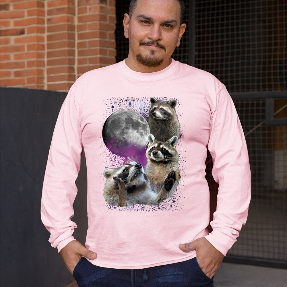 Embrace nature with this quirky raccoon and moon design, perfect for space and animal lovers. Ideal for casual wear or gifts.