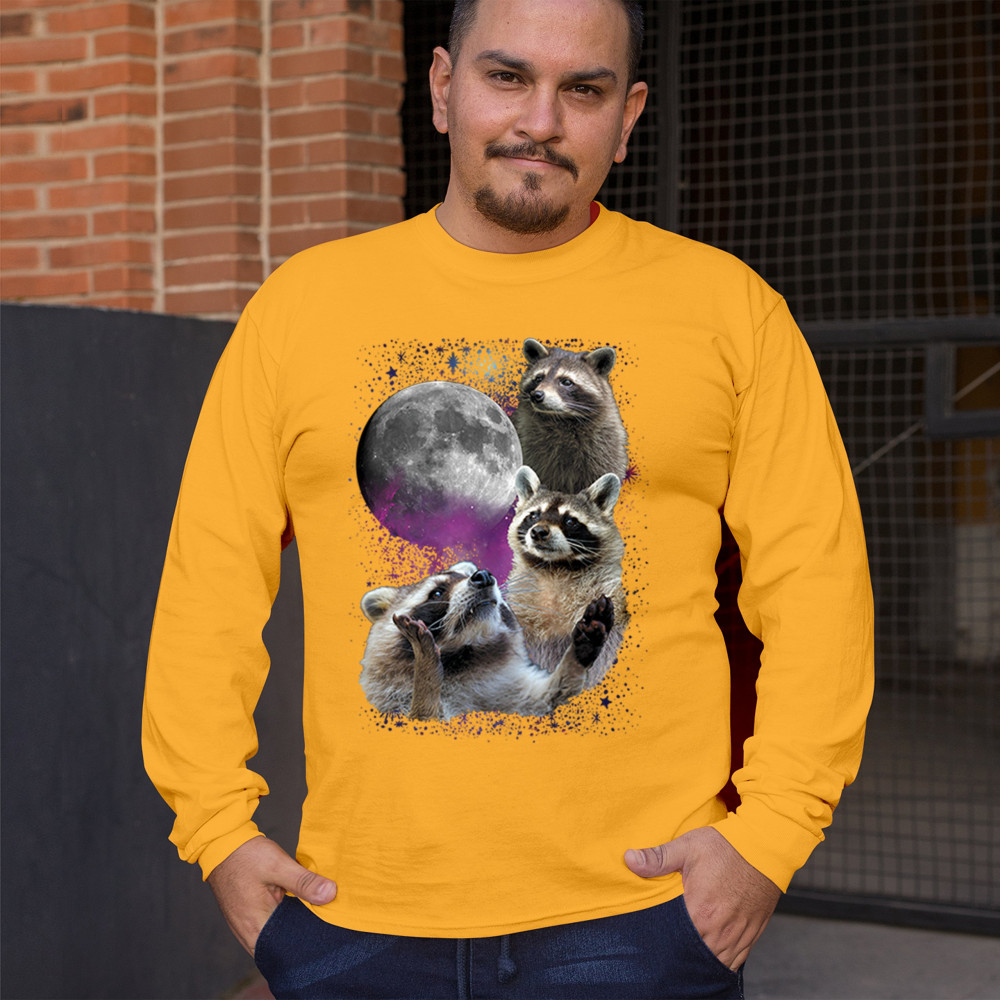 Embrace nature with this quirky raccoon and moon design, perfect for space and animal lovers. Ideal for casual wear or gifts.