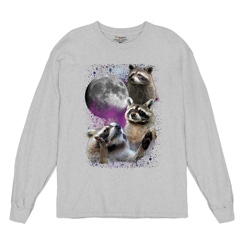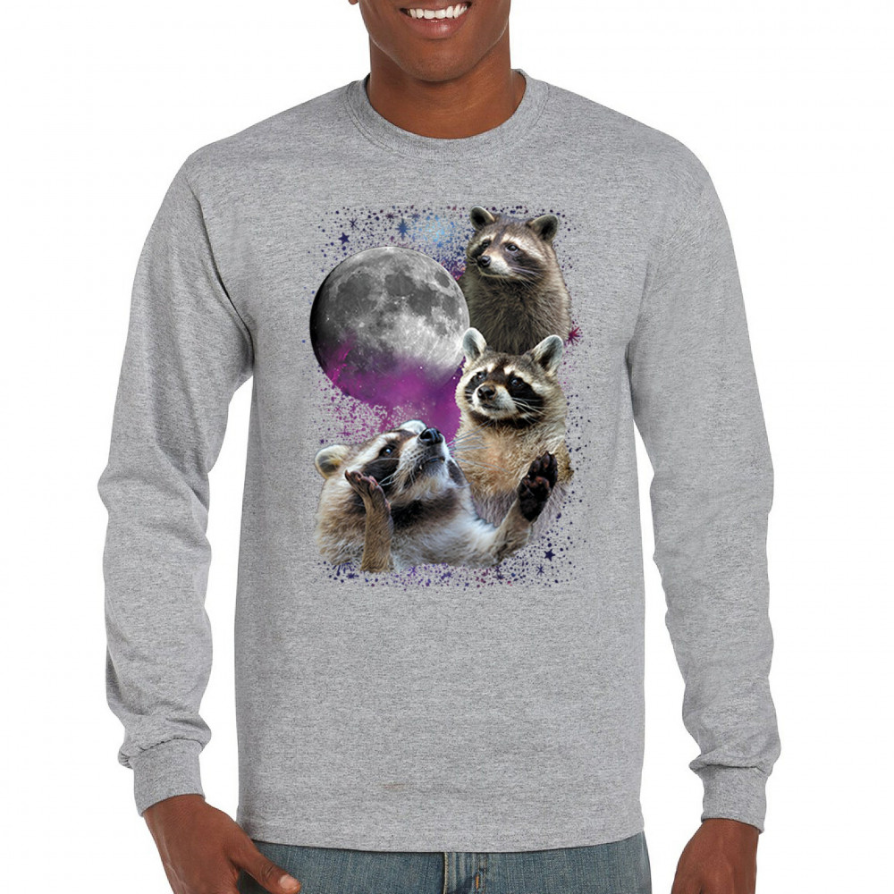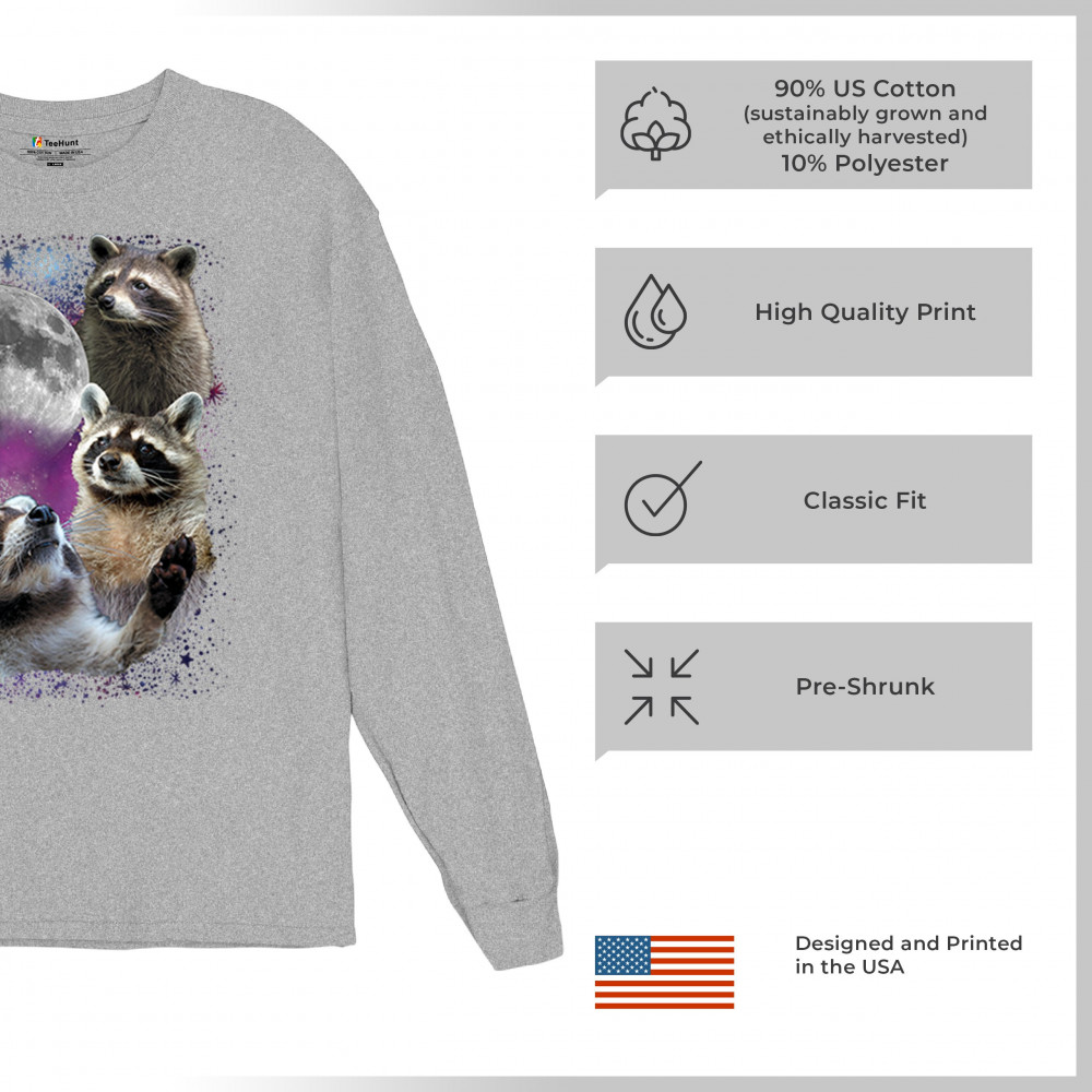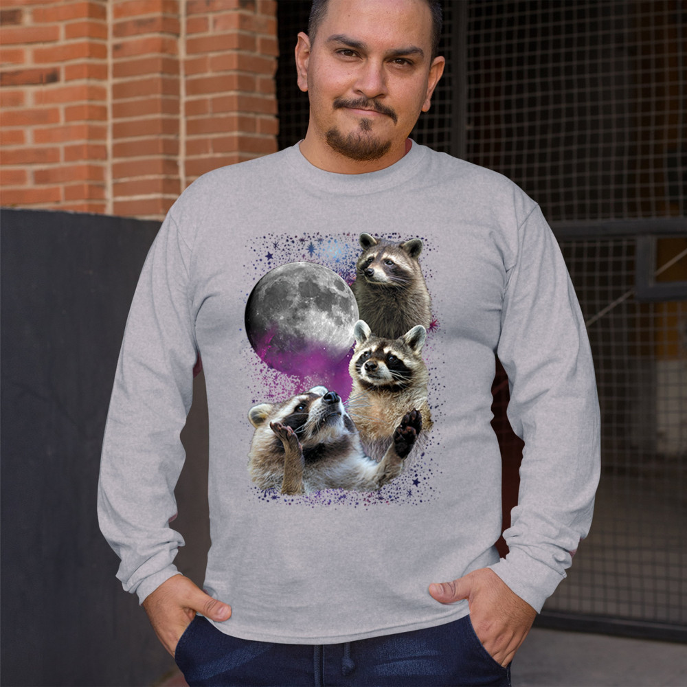 Embrace nature with this quirky raccoon and moon design, perfect for space and animal lovers. Ideal for casual wear or gifts.