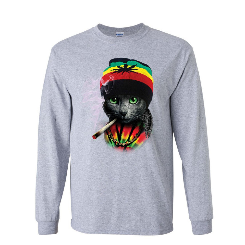 RASTA CAT long sleeve t-shirt smoking joint 420 jamaica marijuana pot weed tee gray