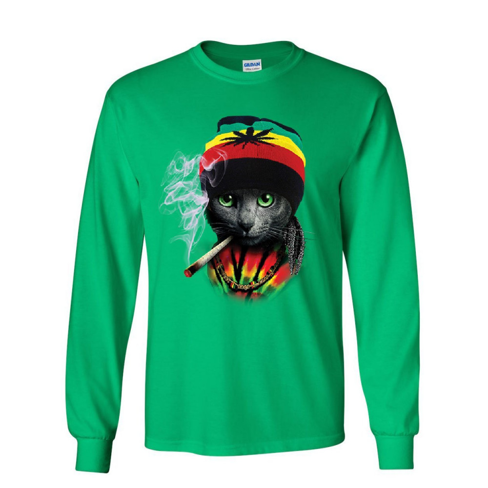 RASTA CAT long sleeve t-shirt smoking joint 420 jamaica marijuana pot weed tee green