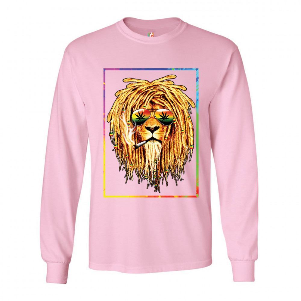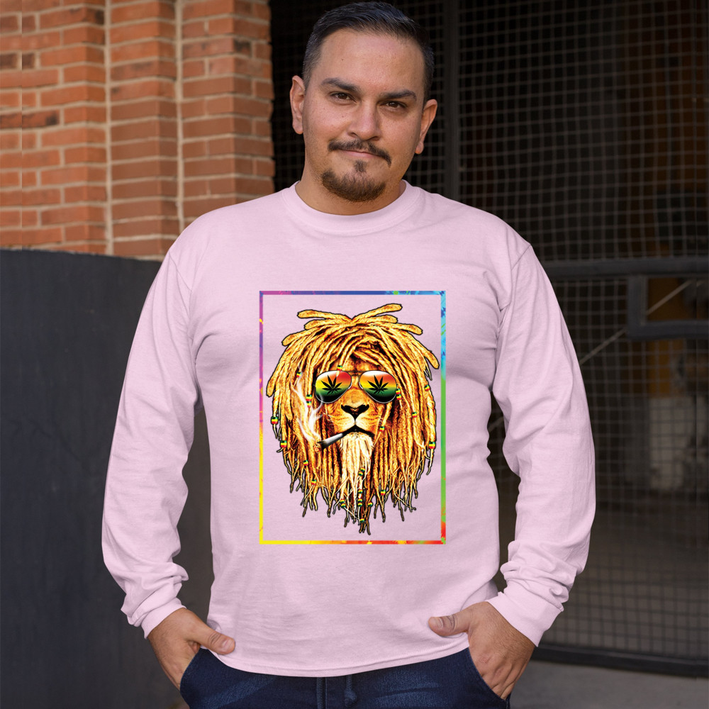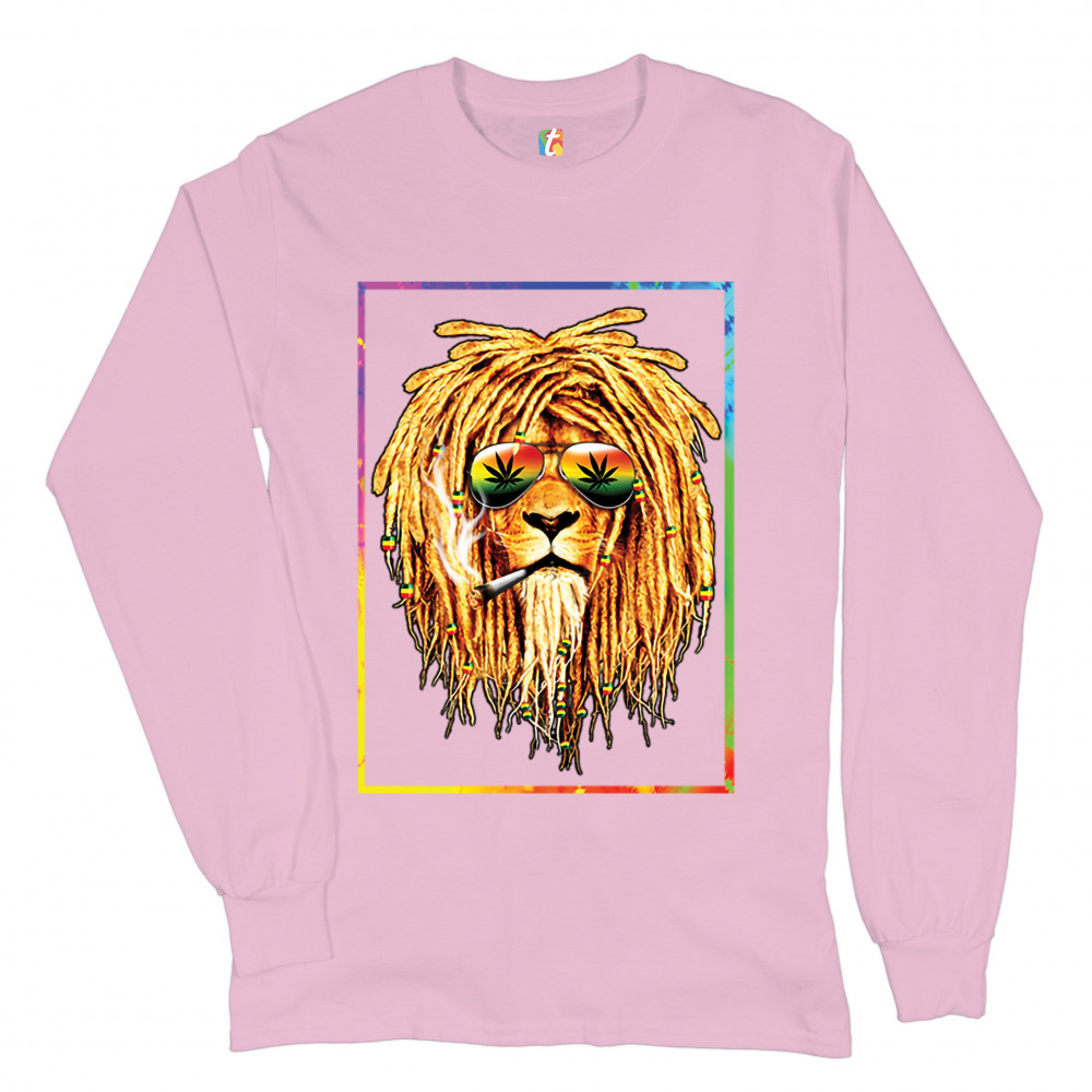 A print featuring a lion with dreadlocks smoking a joint and wearing sunglasses with marijuana leaves reflected in the them. The beads on the lion's dreadlocks and the glasses are painted with traditional Jamaican colors. Great choice for a pot aficionado