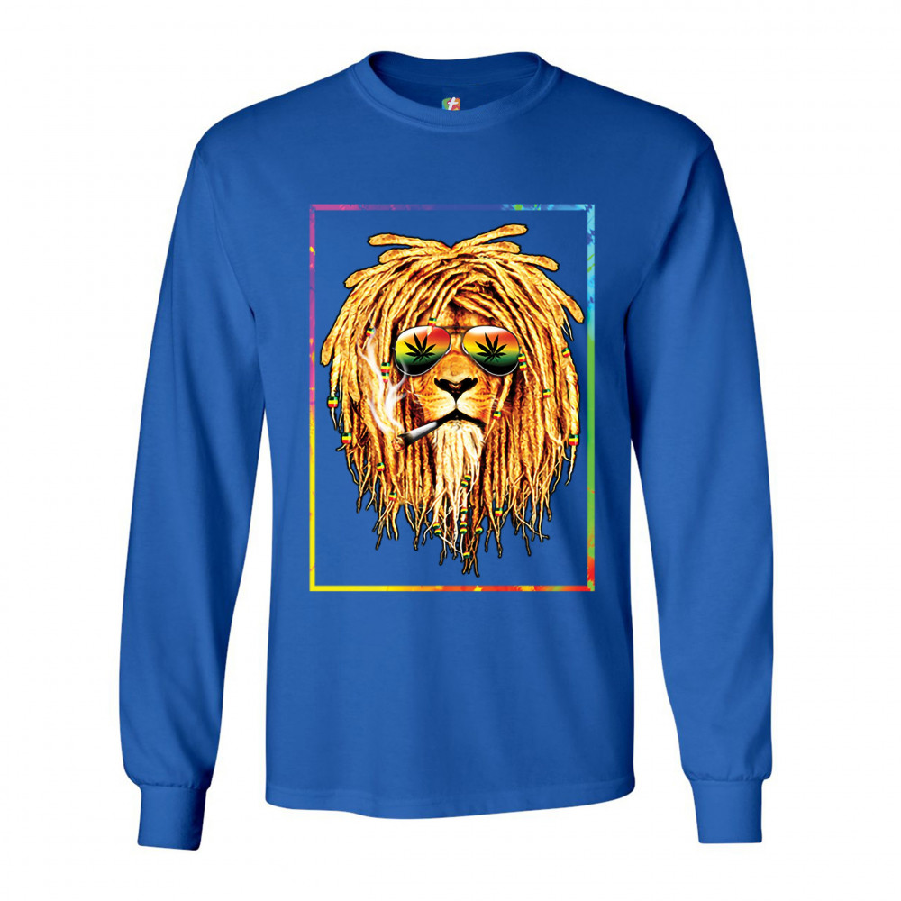 RASTA LION WEARING SUNGLASSES long sleeve t-shirt 420 pot cannabis smoking jah royal blue