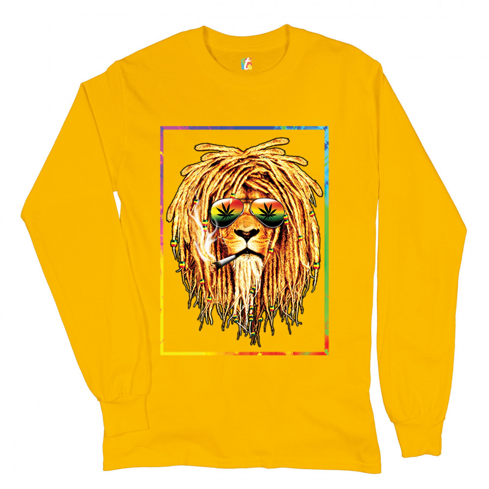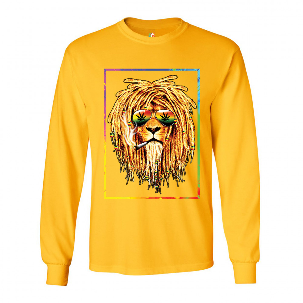 RASTA LION WEARING SUNGLASSES long sleeve t-shirt 420 pot cannabis smoking jah yellow
