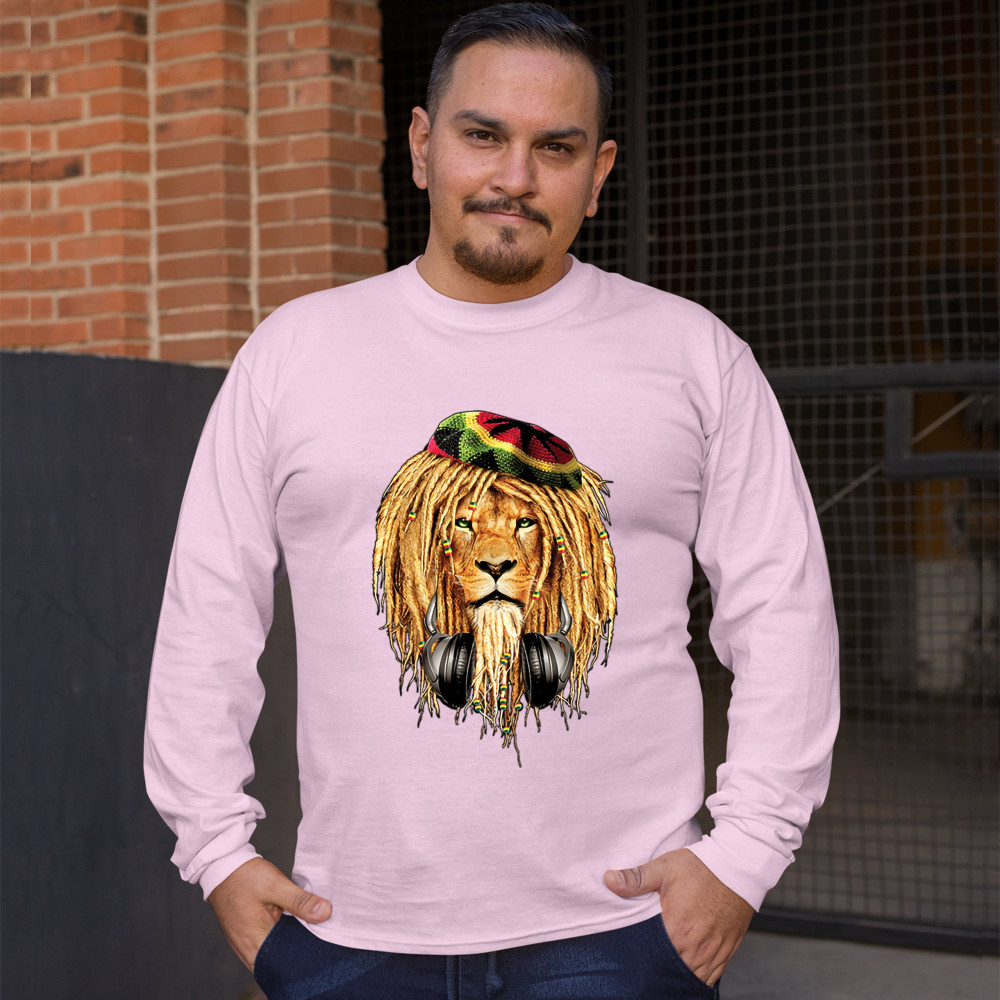 RASTA LION WITH HEADPHONES long sleeve t-shirt jah jamaica reggae 420 culture pink