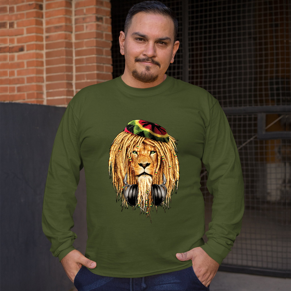 RASTA LION WITH HEADPHONES long sleeve t-shirt jah jamaica reggae 420 culture military green