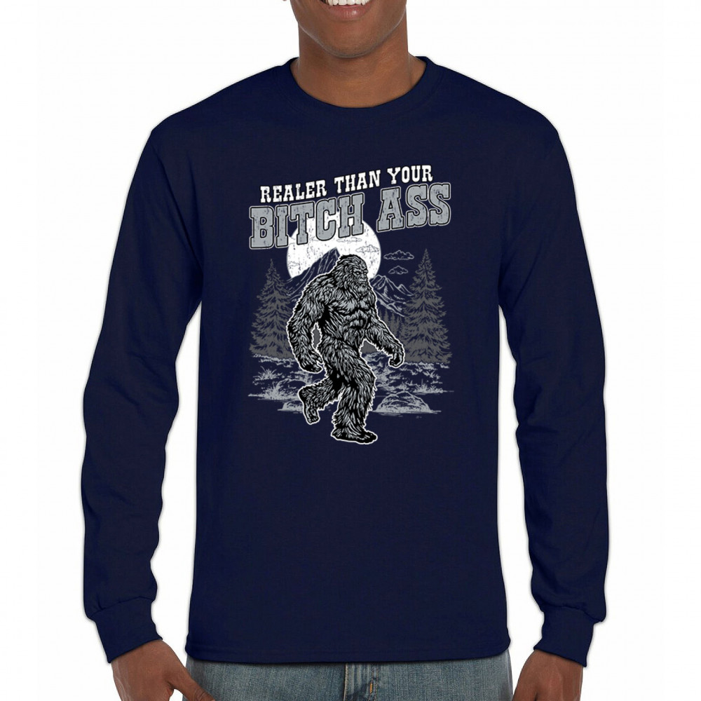 Edgy Bigfoot design with sarcastic cryptid humor and gritty wilderness style. Great for trolls, jokers, and rugged outdoors fans.