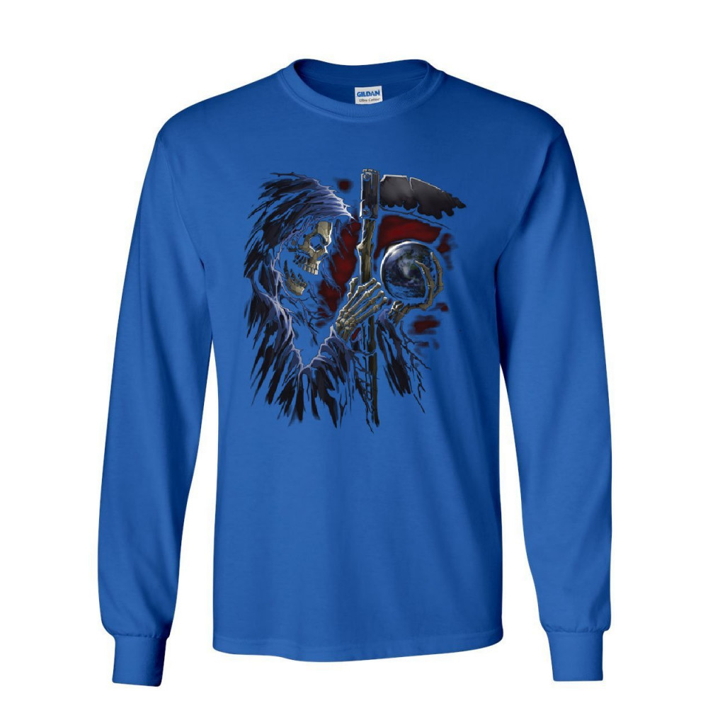 REAPER SPHERE SCYTHE long sleeve t-shirt death skull creepy scary monster tee royal blue