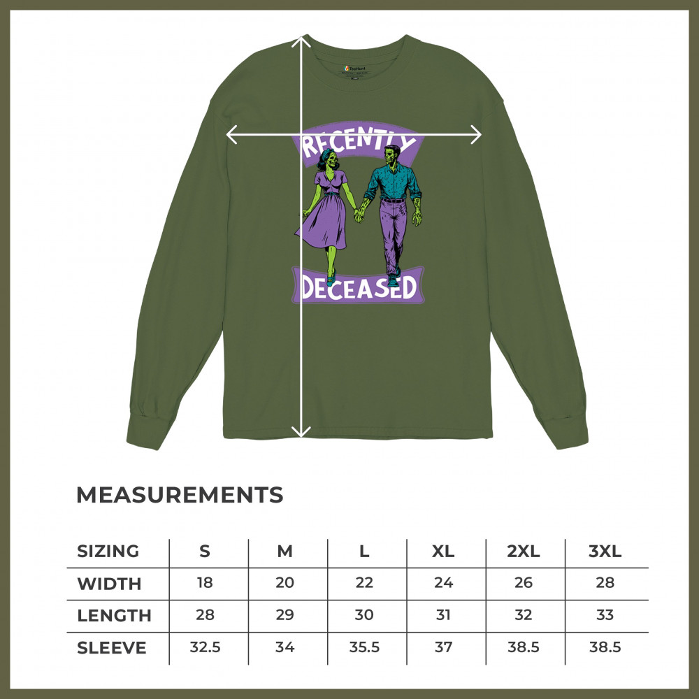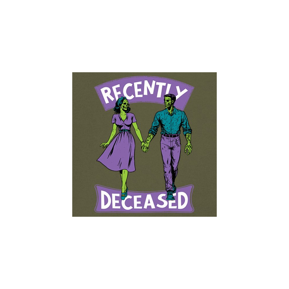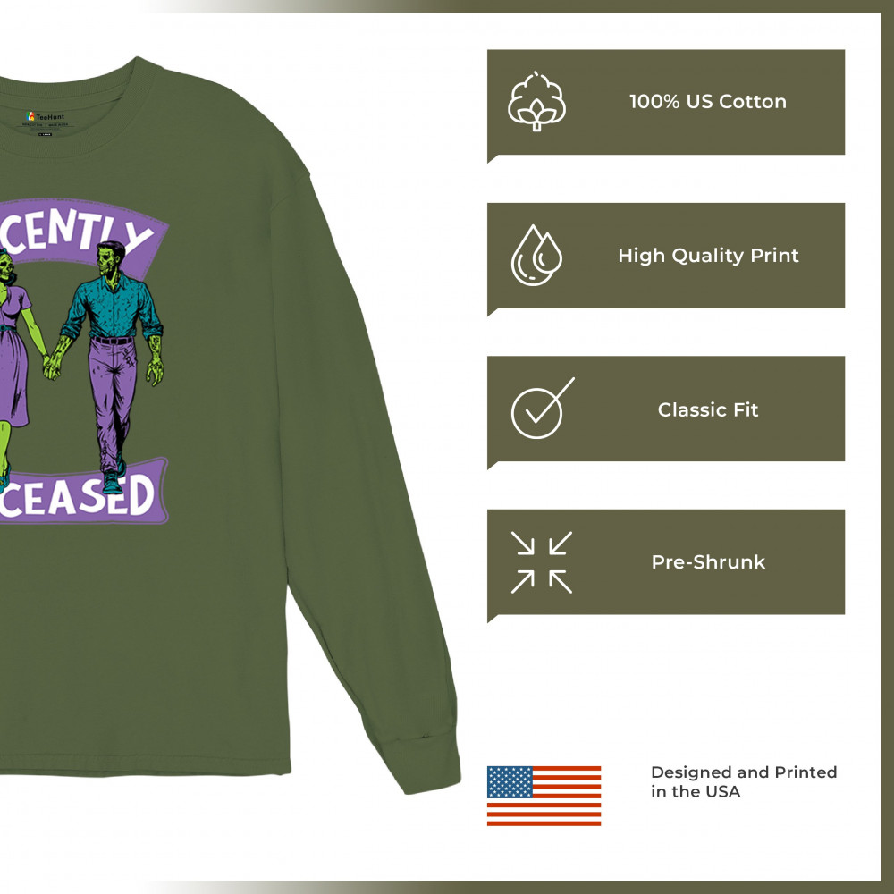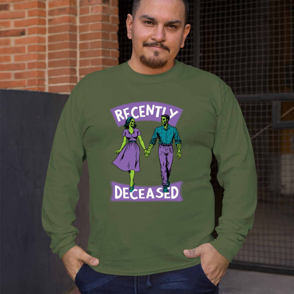 Recently Deceased zombie couple shirt with undead lovers design, spooky season humor, Halloween zombie outfit, and haunted house vibes.