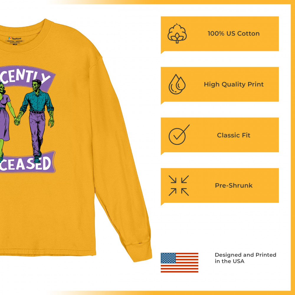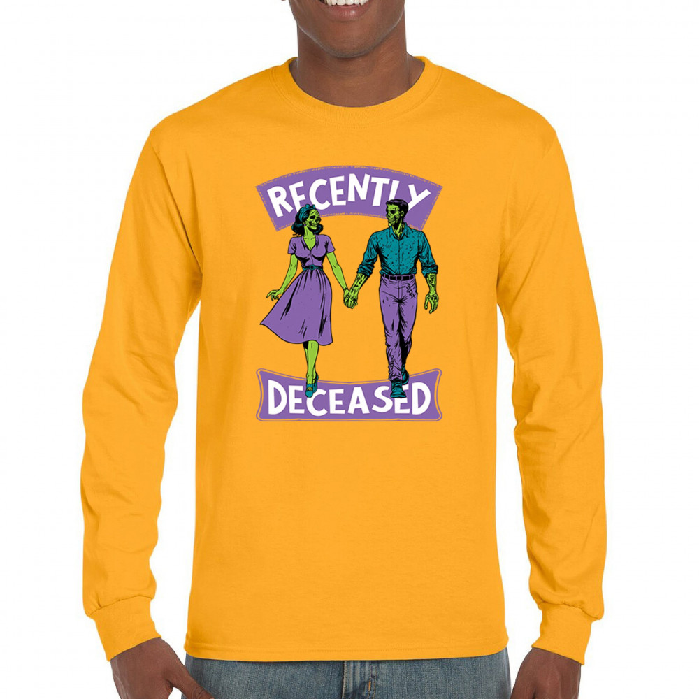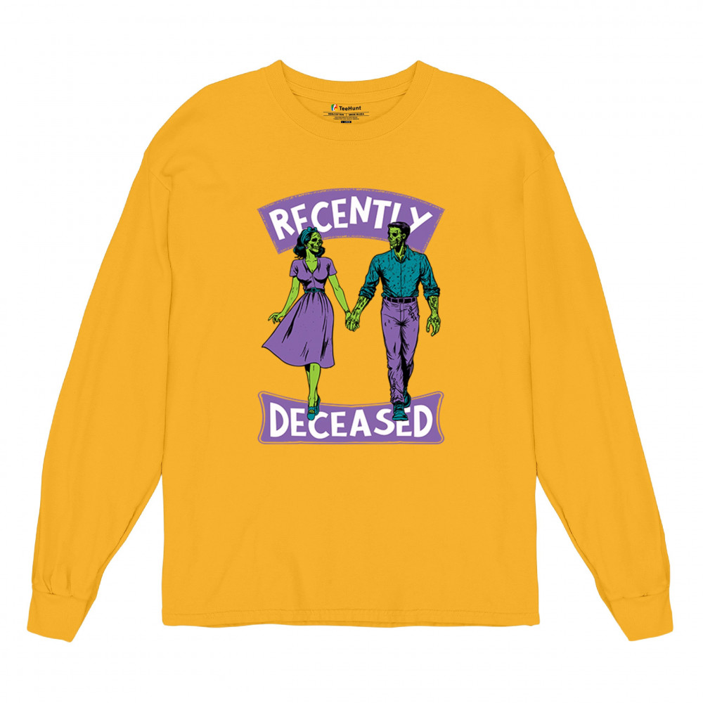 Recently Deceased zombie couple shirt with undead lovers design, spooky season humor, Halloween zombie outfit, and haunted house vibes.