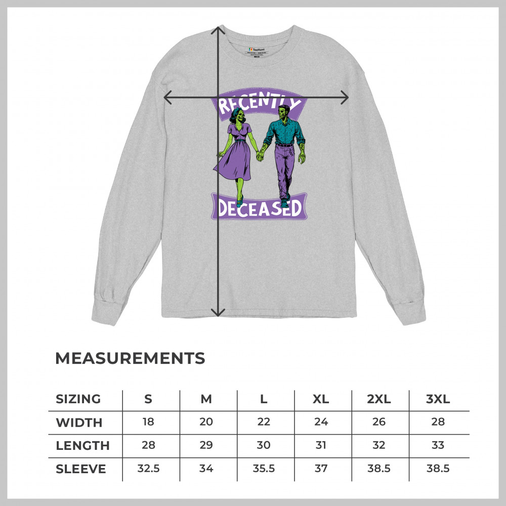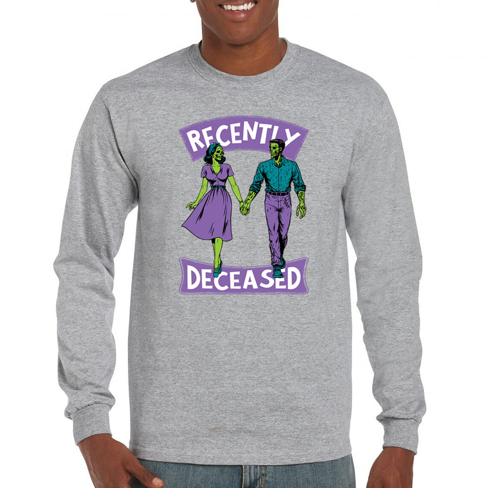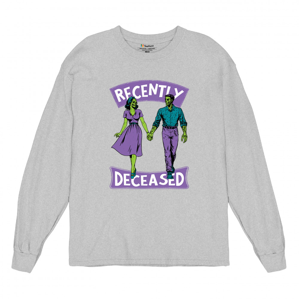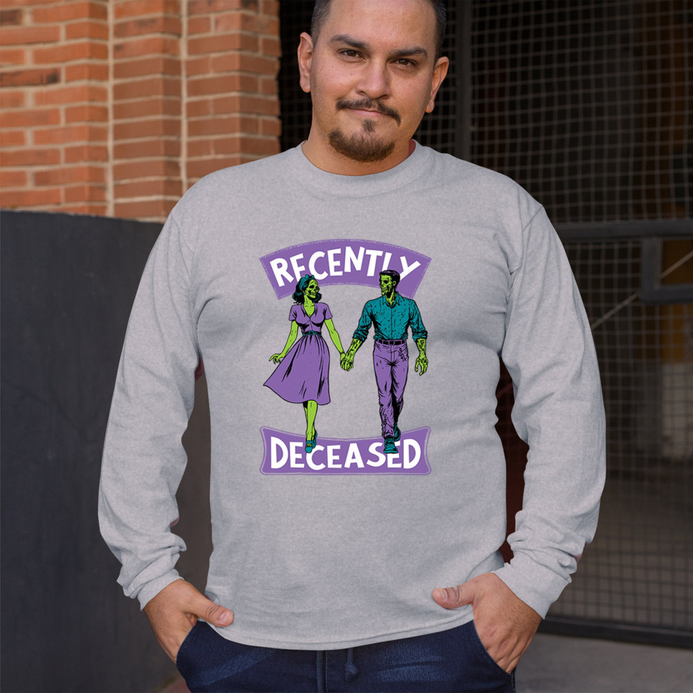 Recently Deceased zombie couple shirt with undead lovers design, spooky season humor, Halloween zombie outfit, and haunted house vibes.