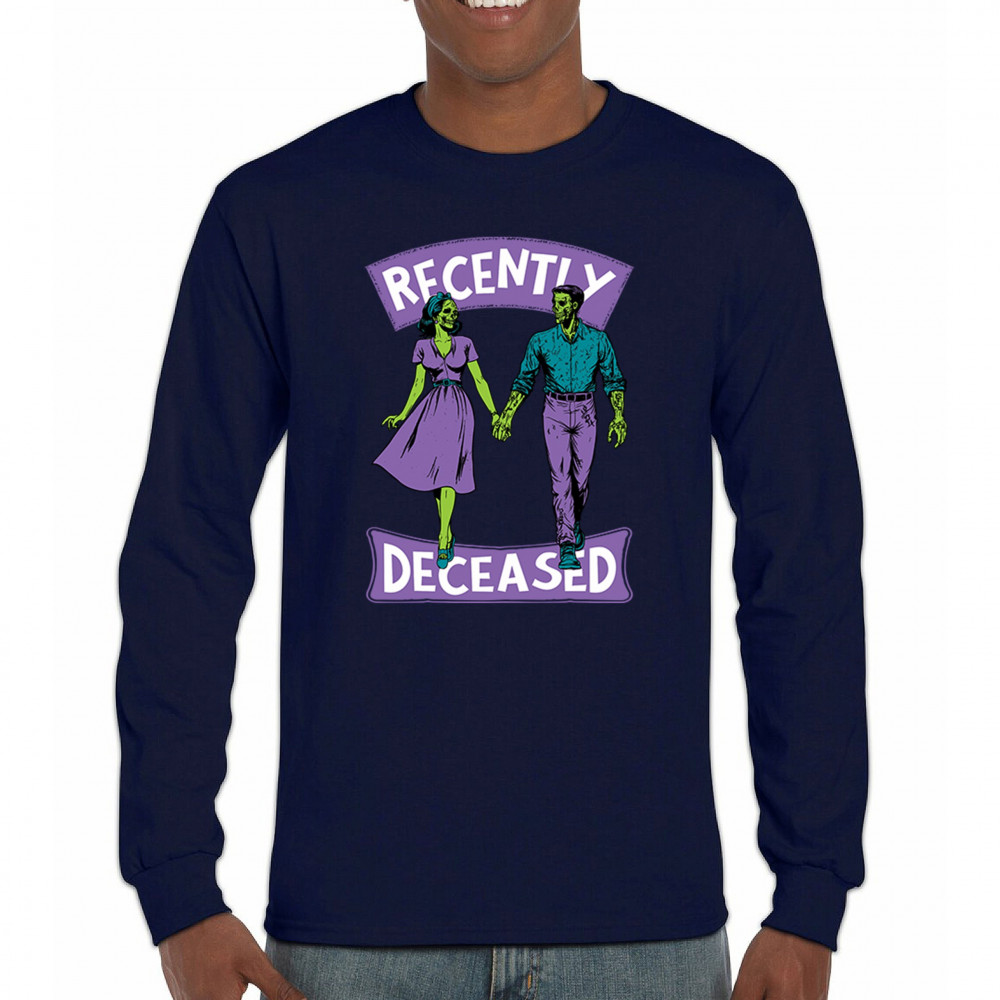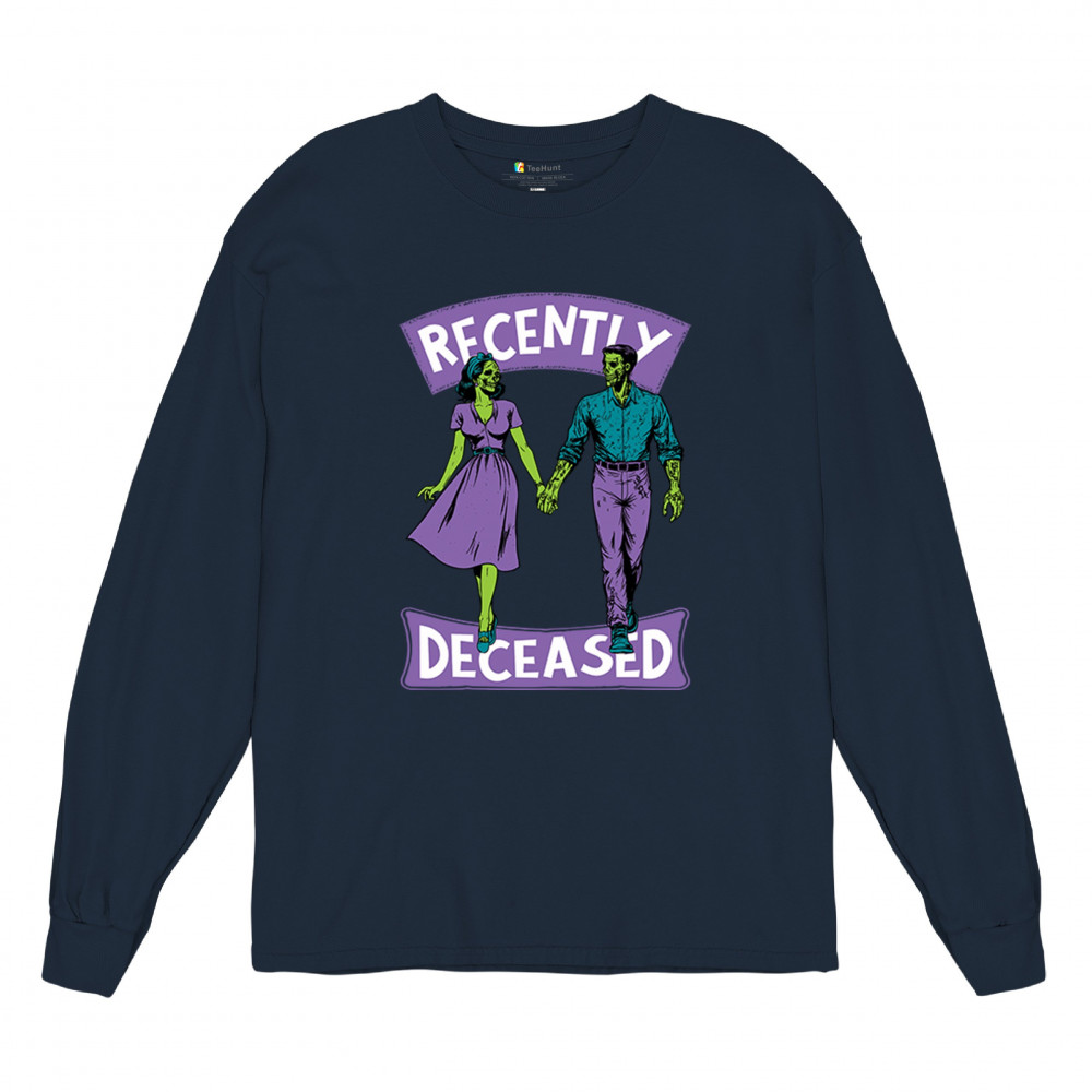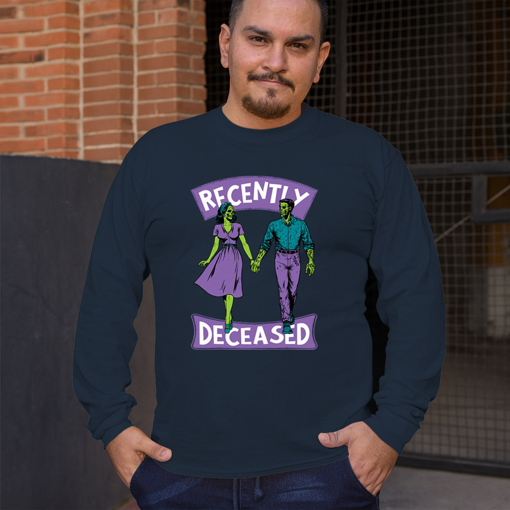 Recently Deceased zombie couple shirt with undead lovers design, spooky season humor, Halloween zombie outfit, and haunted house vibes.