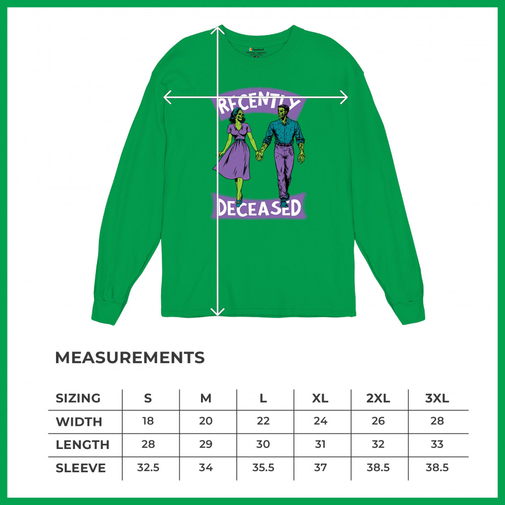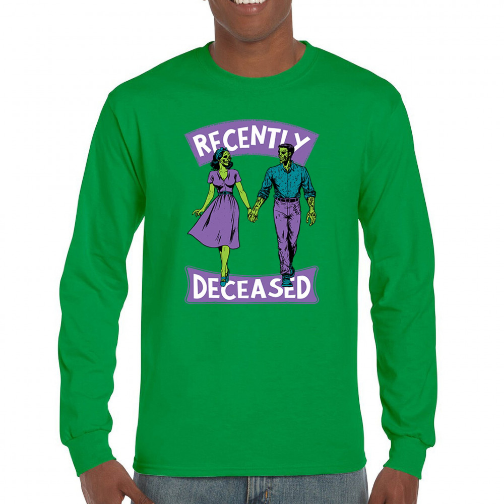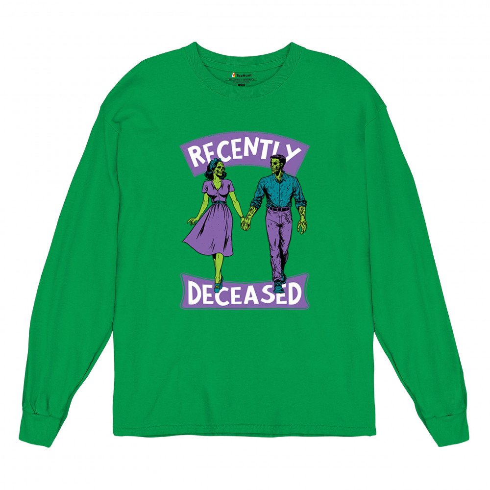Recently Deceased zombie couple shirt with undead lovers design, spooky season humor, Halloween zombie outfit, and haunted house vibes.