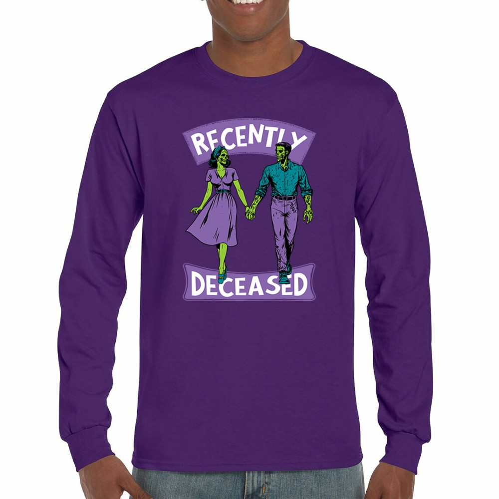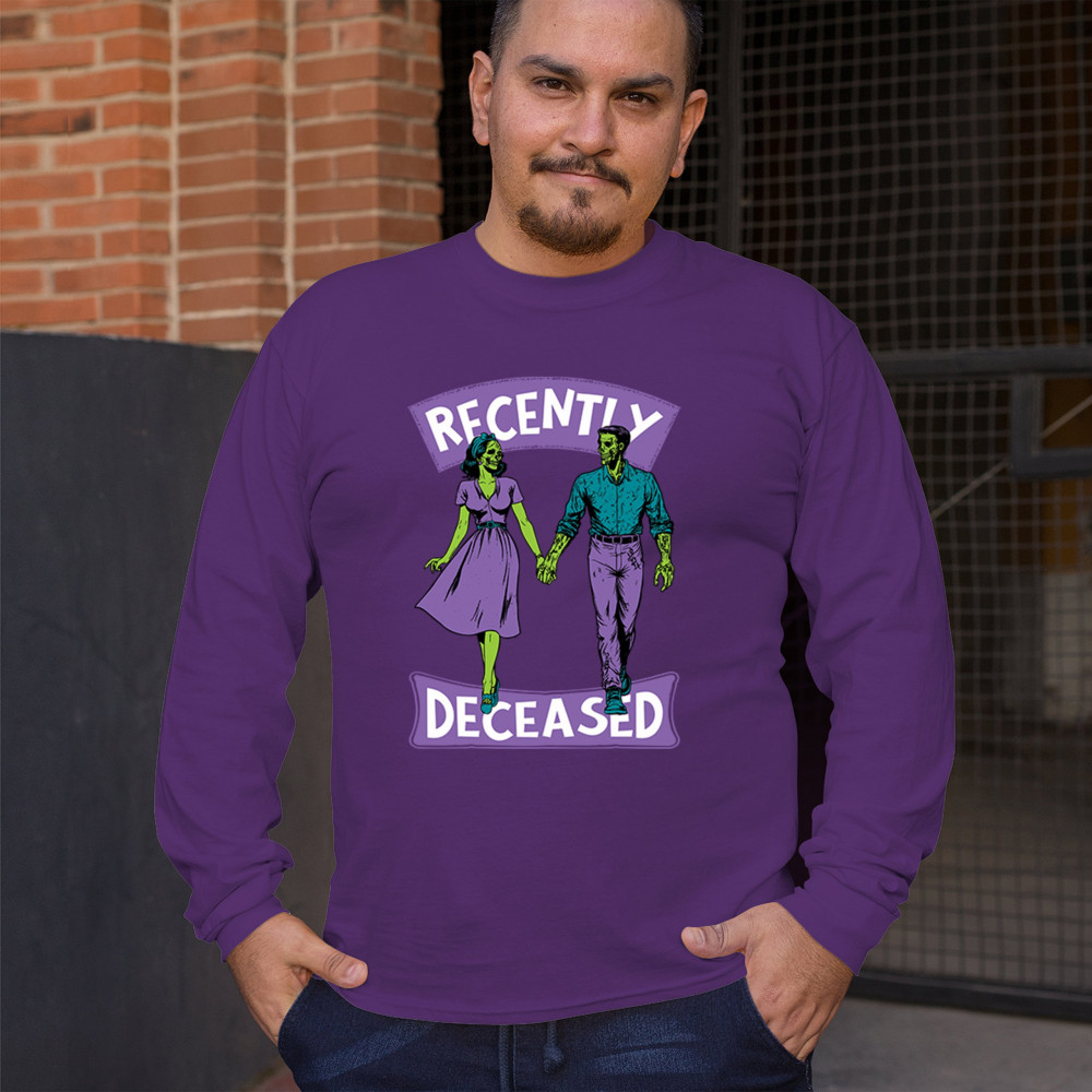 Recently Deceased zombie couple shirt with undead lovers design, spooky season humor, Halloween zombie outfit, and haunted house vibes.