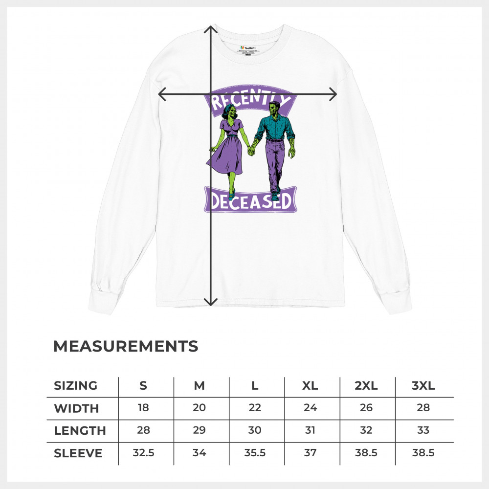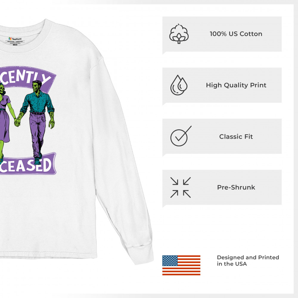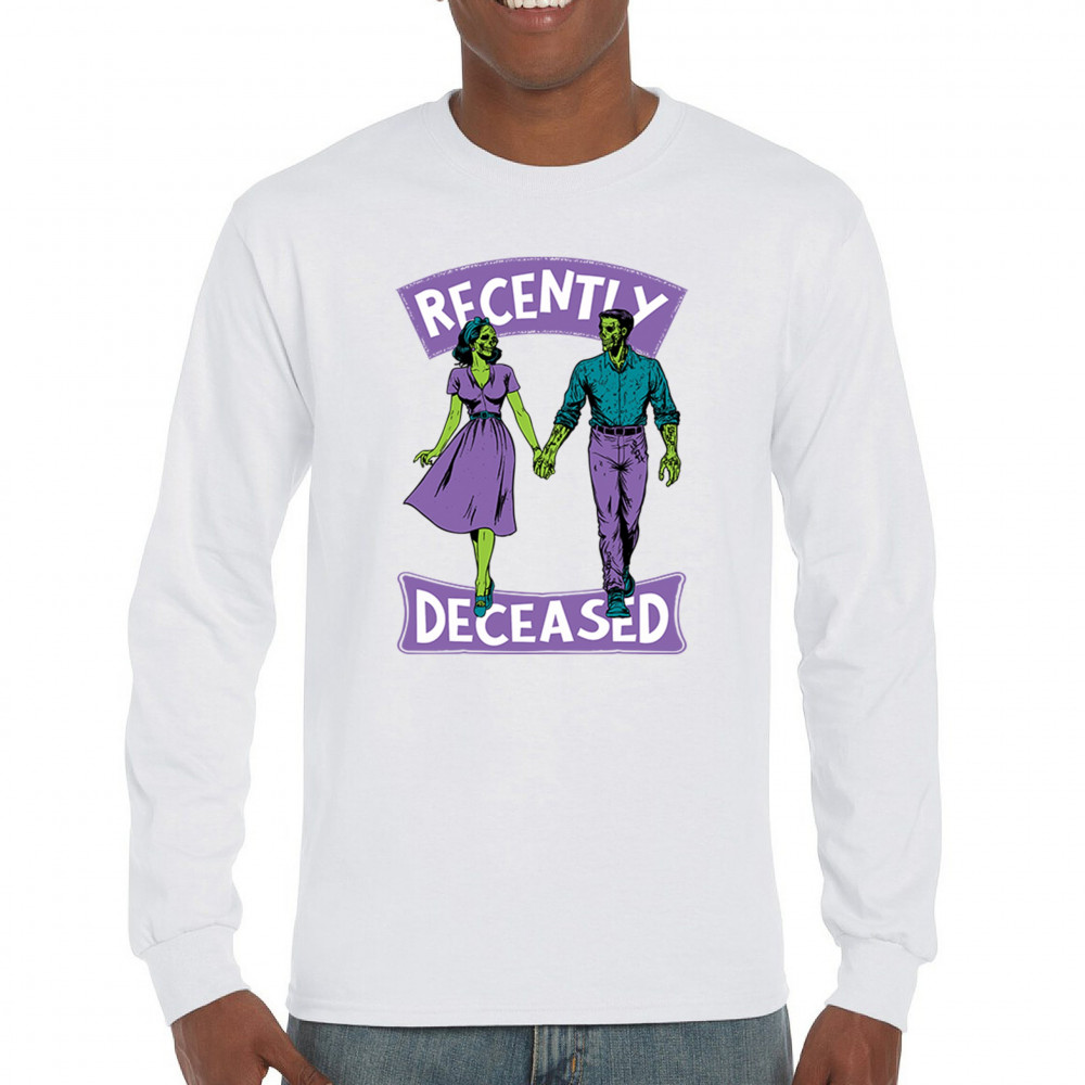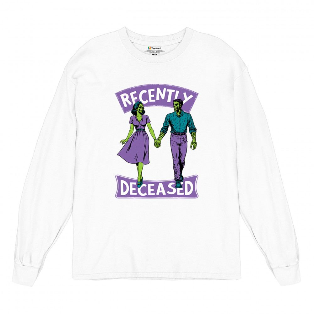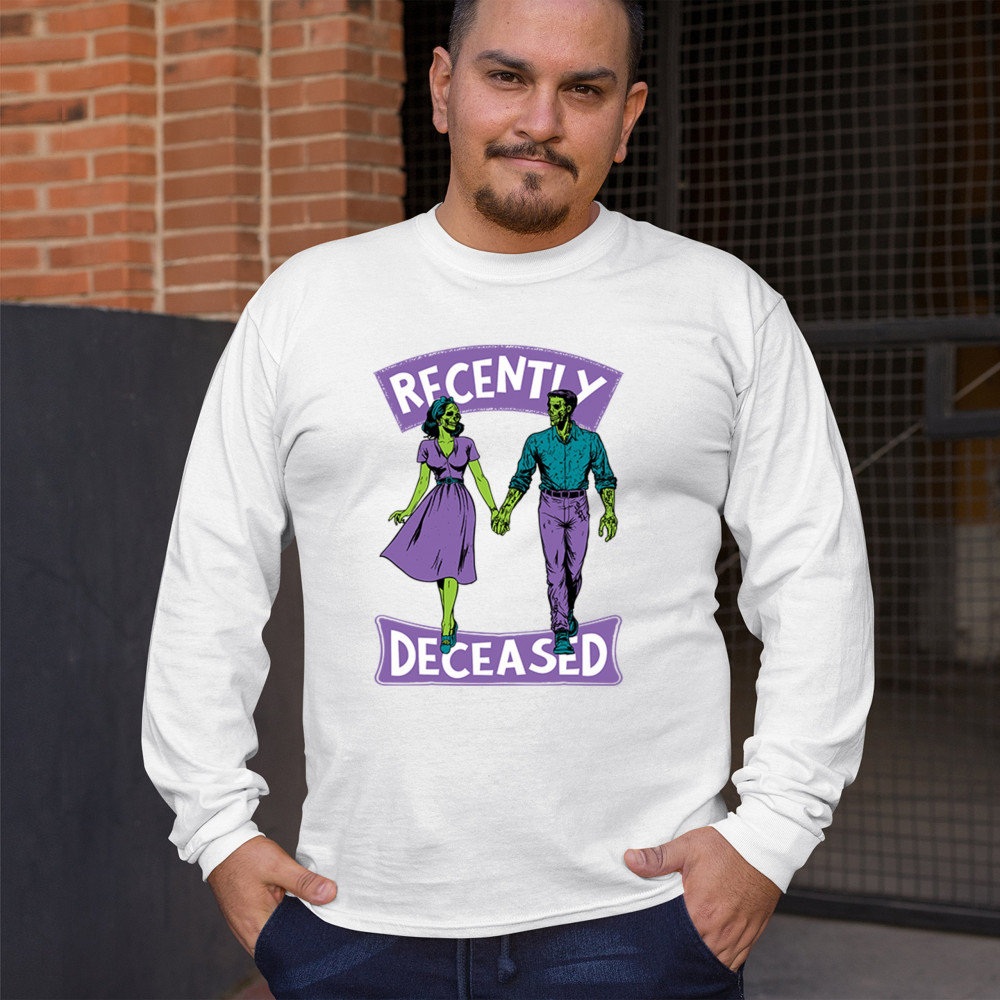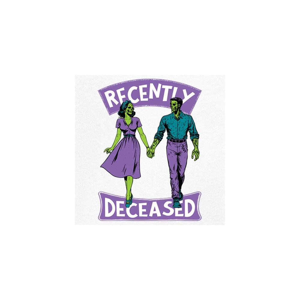 Recently Deceased zombie couple shirt with undead lovers design, spooky season humor, Halloween zombie outfit, and haunted house vibes.