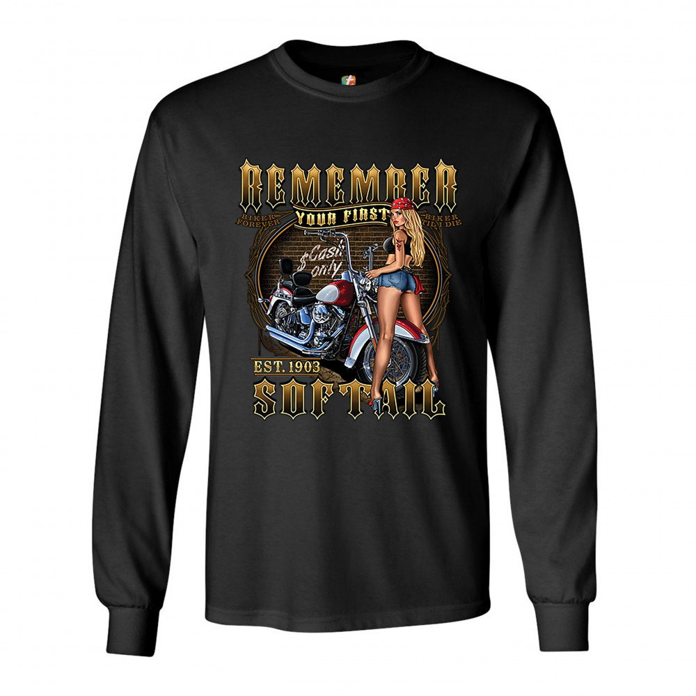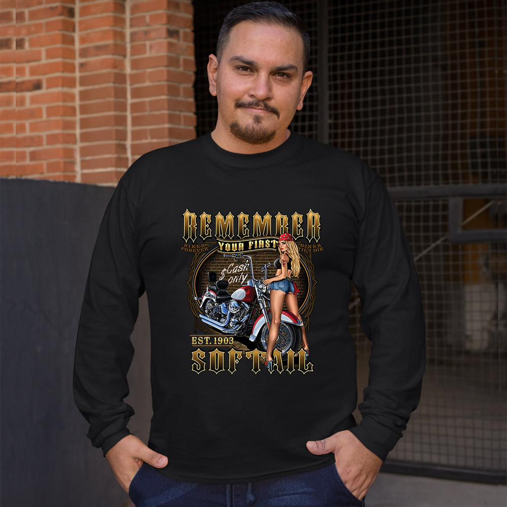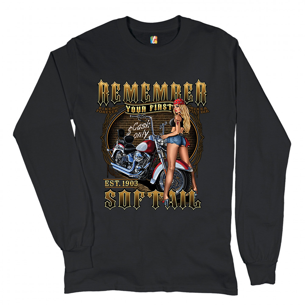 A print featuring a sexy pin-up girl in daisy dukes standing in front of a motorcycle. In the background there is a brick wall with "$ cash only" written on it. The print says: "Remember your first softail, biker forever, biker til i die, est. 1903". A gr