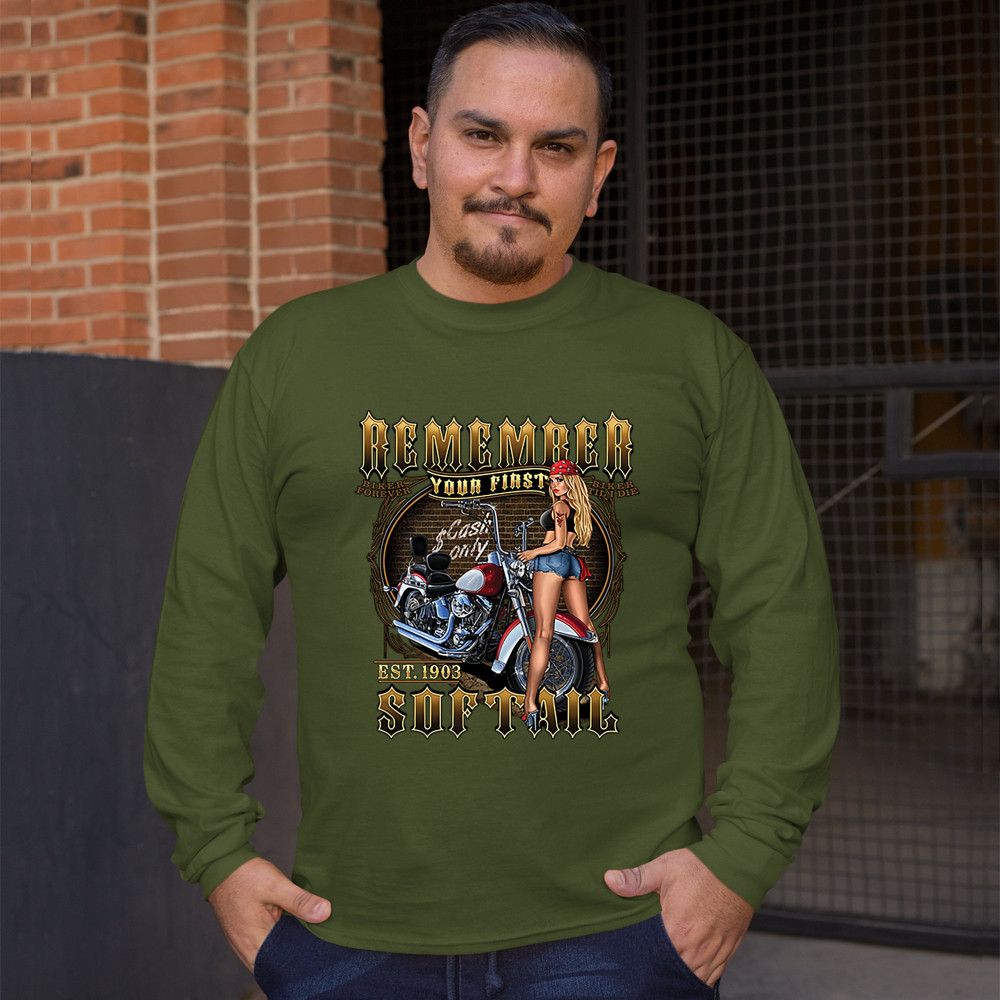 REMEMBER YOUR FIRST SOFTAIL long sleeve t-shirt mc biker forever pin-up girl military green