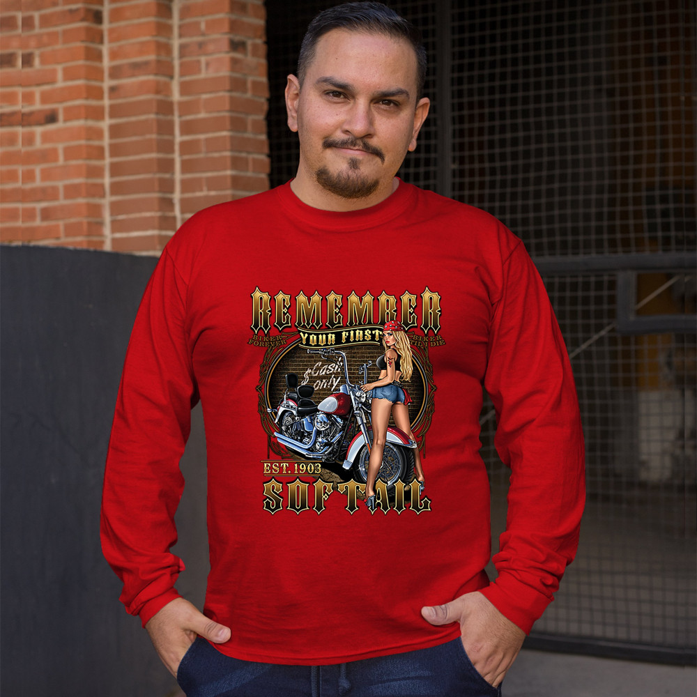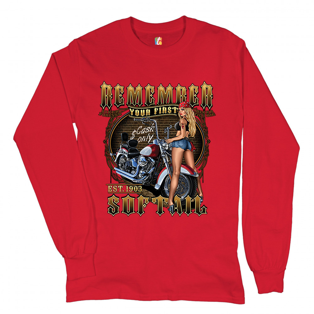 A print featuring a sexy pin-up girl in daisy dukes standing in front of a motorcycle. In the background there is a brick wall with "$ cash only" written on it. The print says: "Remember your first softail, biker forever, biker til i die, est. 1903". A gr