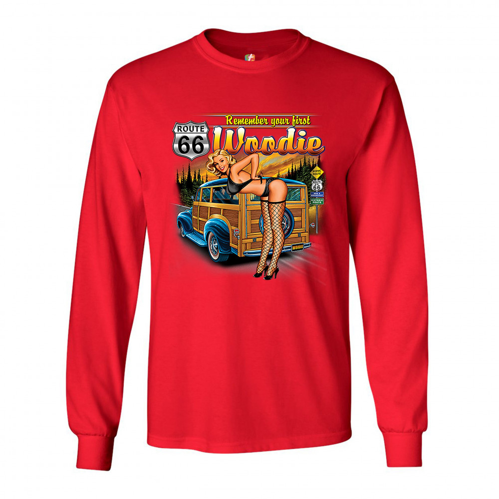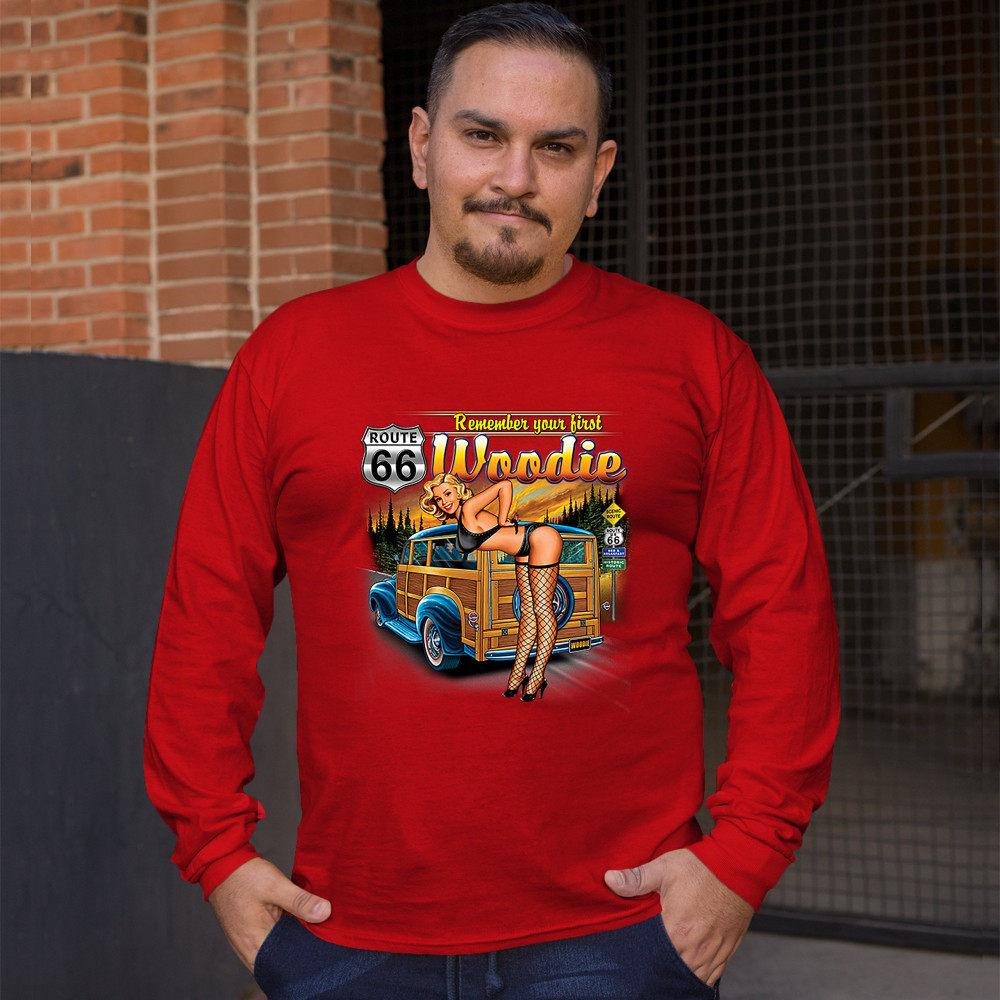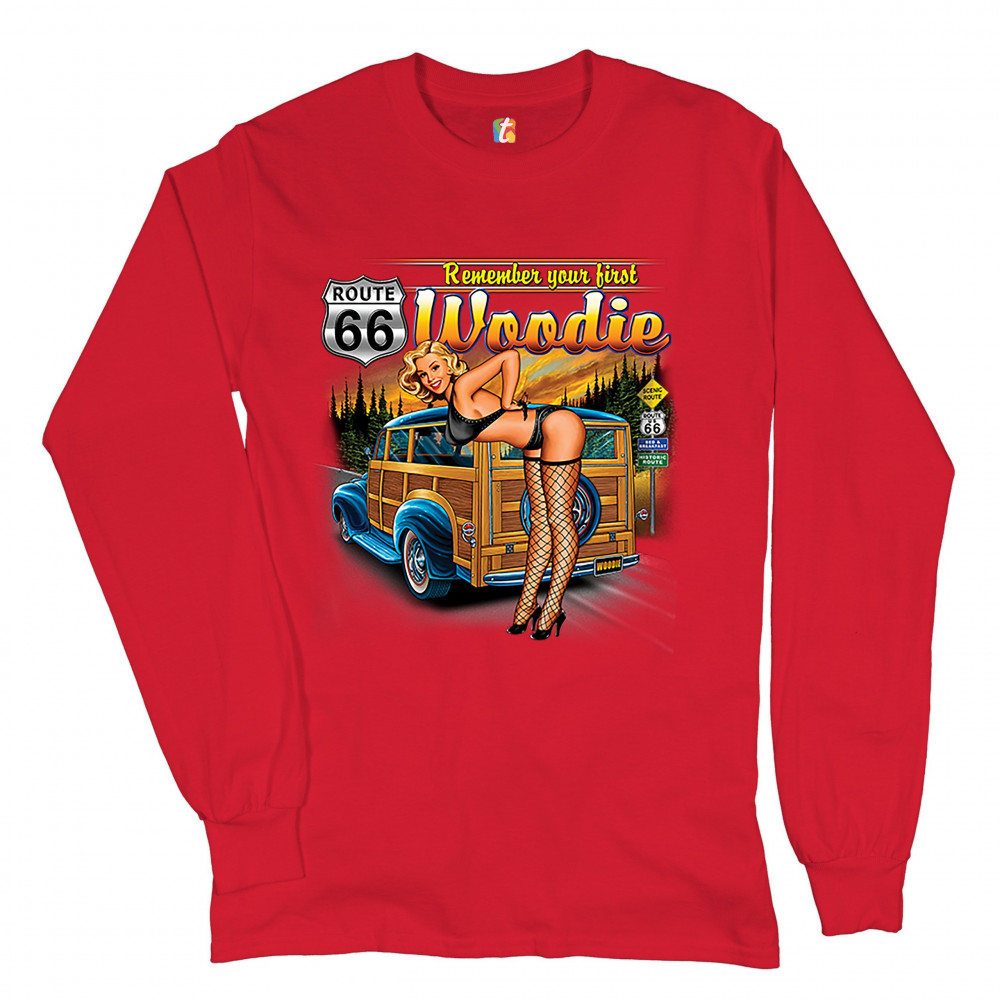 A print featuring a sexy blonde pin-up girl bending over and taking off her bra. Behind her there is a woodie wagon driving on a road. The print says: "Remeber your first woodie" and features a Route 66. A great choice for a fan of the legendary Mother Ro