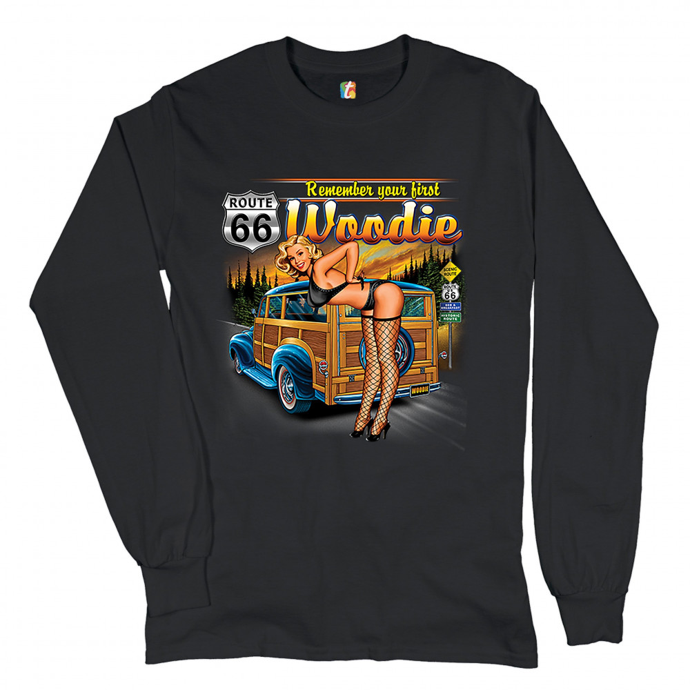 A print featuring a sexy blonde pin-up girl bending over and taking off her bra. Behind her there is a woodie wagon driving on a road. The print says: "Remeber your first woodie" and features a Route 66. A great choice for a fan of the legendary Mother Ro
