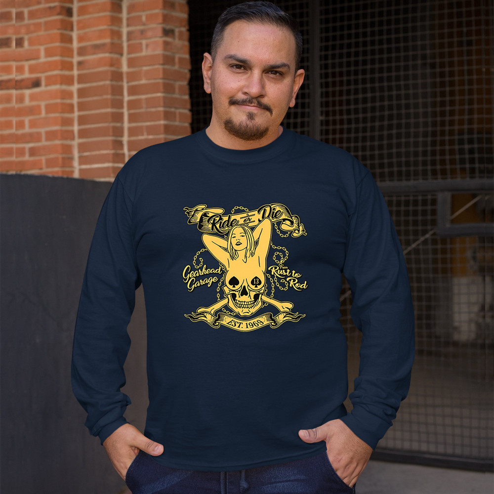 RIDE OR DIE long sleeve t-shirt gearhead garage from rust to rod biker babe navy blue