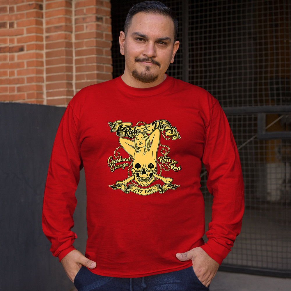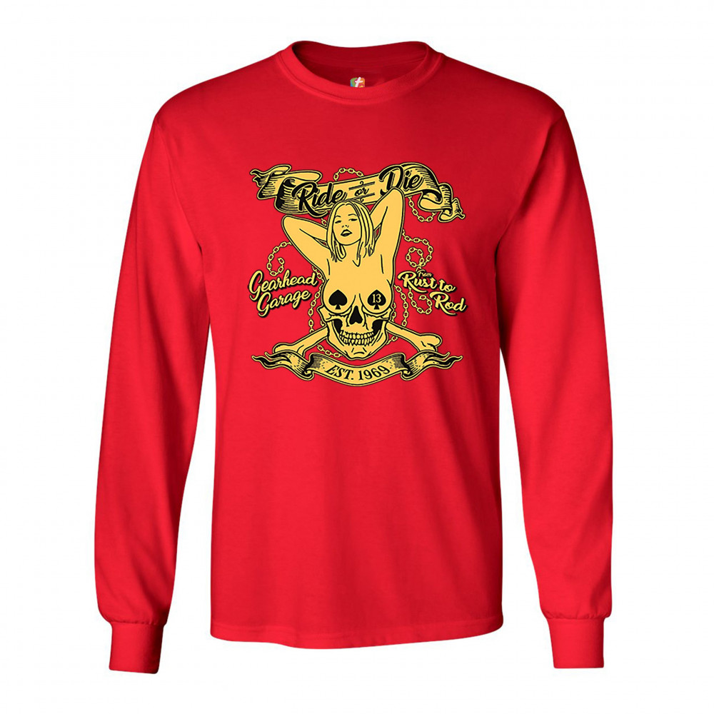 A print featuring a naked woman with her hands behind her head and spades as nipple covers. Her body is mixed with a skull. There are crossed bones and multiple chains in the background. The print says: "Ride or Die, Gearhead Garage, Rust to Rod, Est. 196