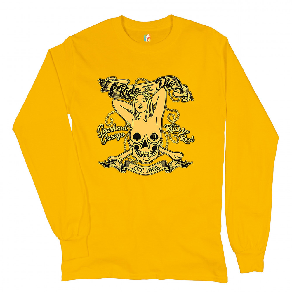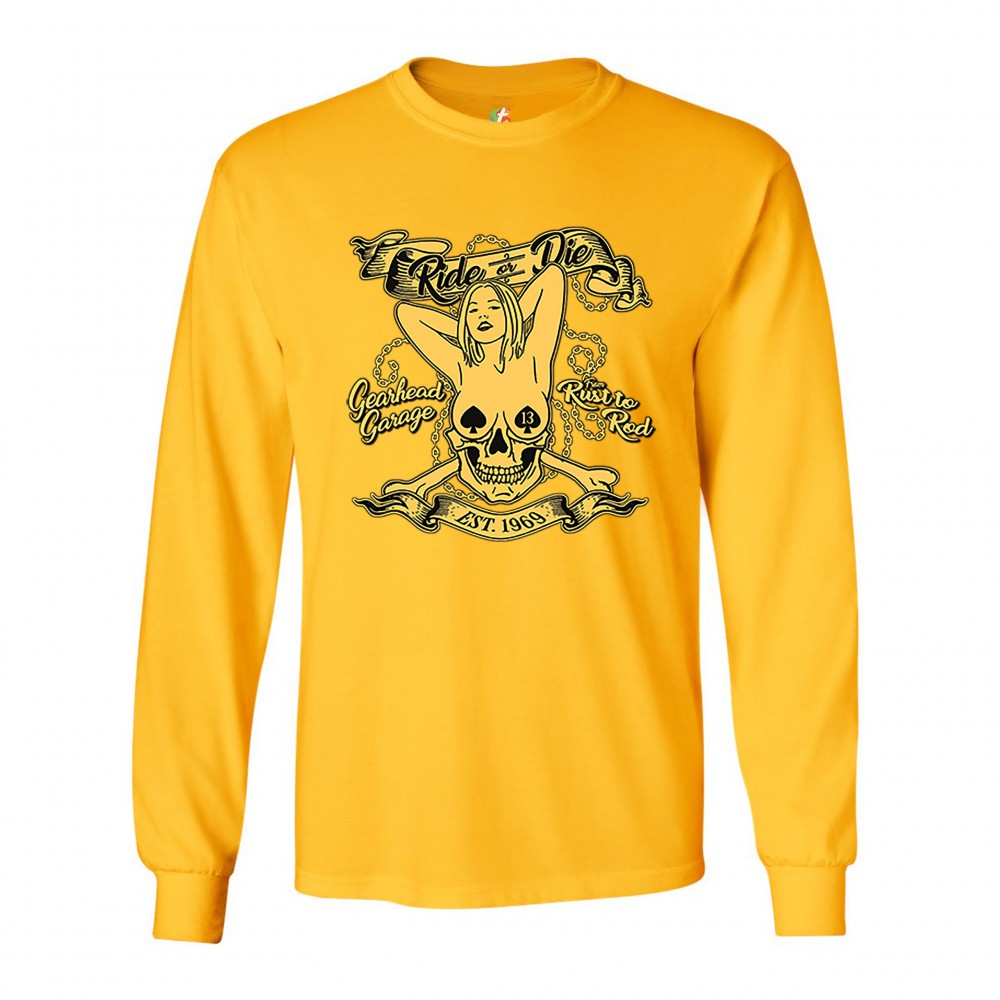 A print featuring a naked woman with her hands behind her head and spades as nipple covers. Her body is mixed with a skull. There are crossed bones and multiple chains in the background. The print says: "Ride or Die, Gearhead Garage, Rust to Rod, Est. 196