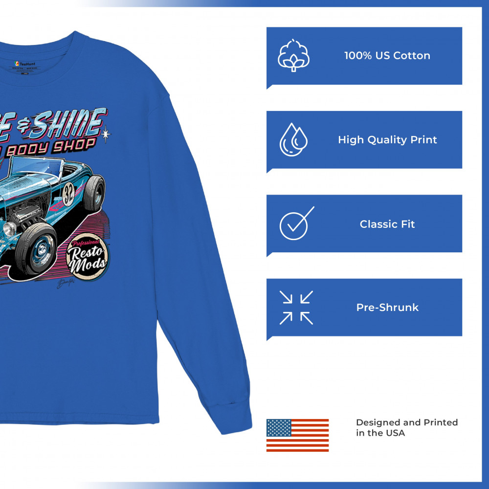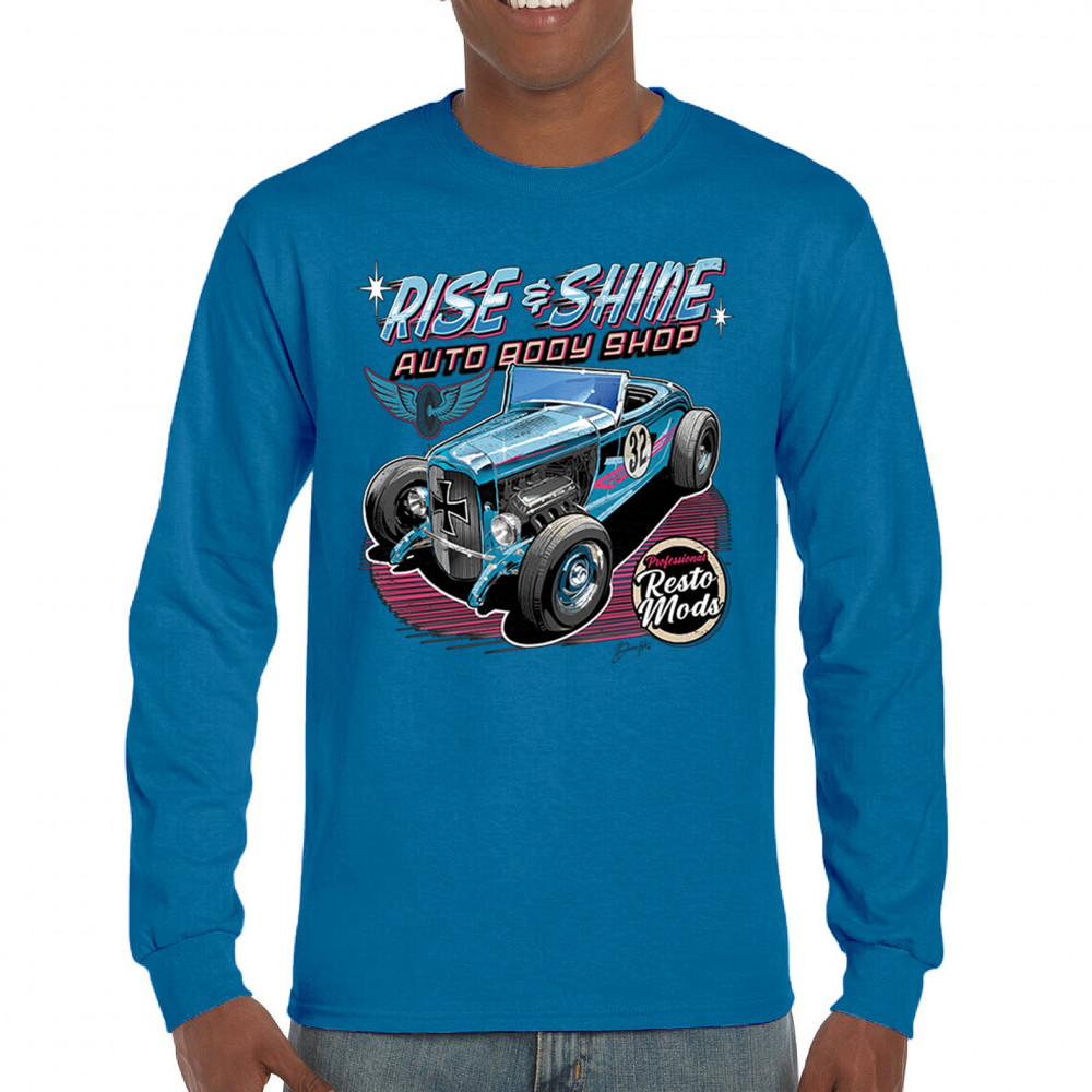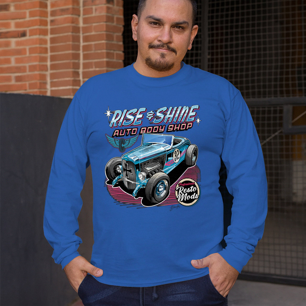 Our "Rise & Shine Auto Body Shop" design is a tribute to classic car culture and professional resto mods. This striking graphic showcases a vintage hot rod, perfect for car enthusiasts and auto restoration fans. Whether you're hitting the car show circuit or working in your garage, this design adds a touch of retro charm to your look. Crafted from premium materials, it offers both comfort and durability, ensuring it stands up to your active lifestyle. Celebrate the art of automotive restoration with this standout design.