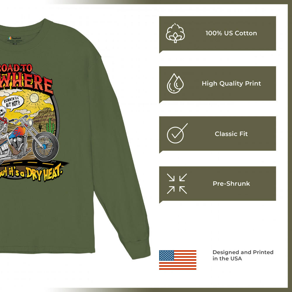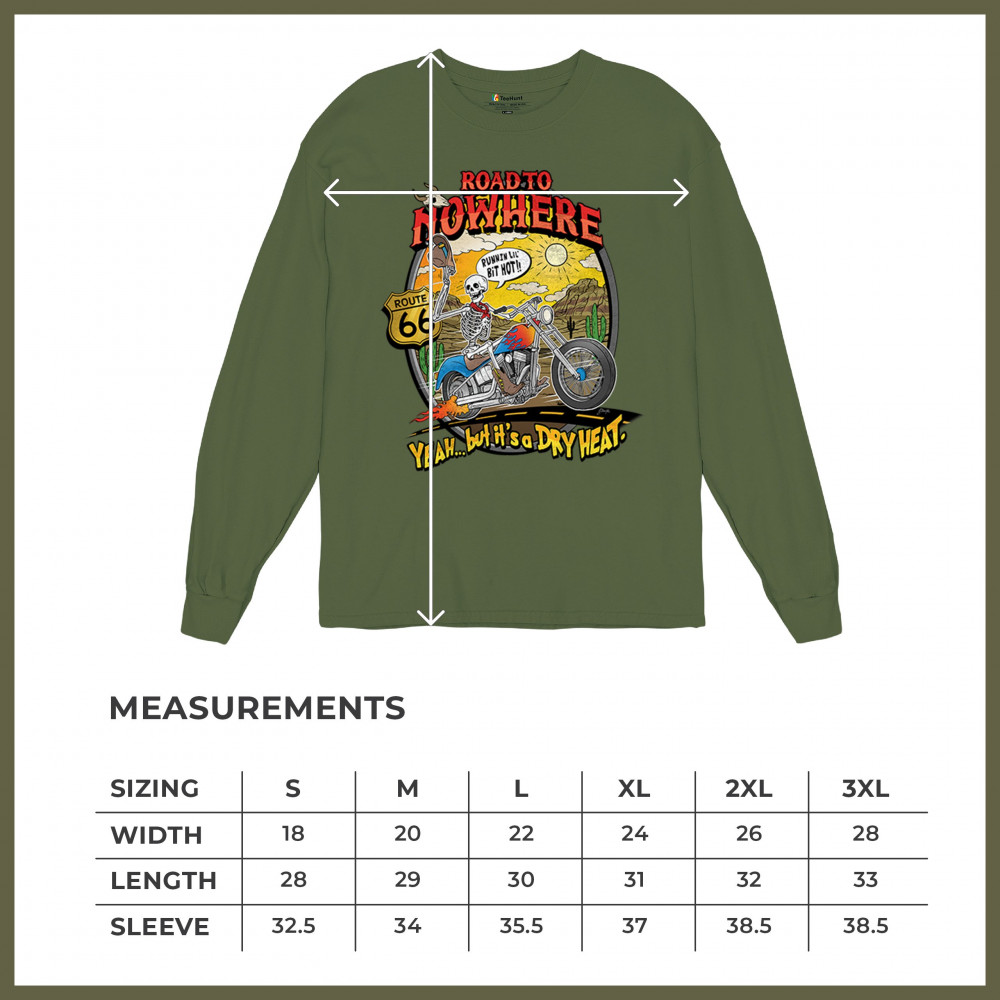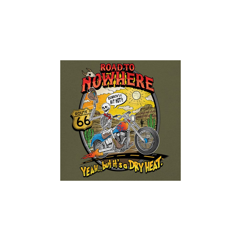 Our 'Road to Nowhere' tee is a salute to the thrill-seekers and the heat-bravers. Adorned with a bold skeleton cruising down Route 66, it embodies the spirit of adventure with a touch of playful defiance. A statement piece for anyone who lives for the ride and laughs in the face of danger. Join the ride into the sunset with this daring design.