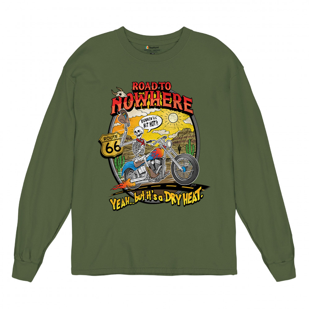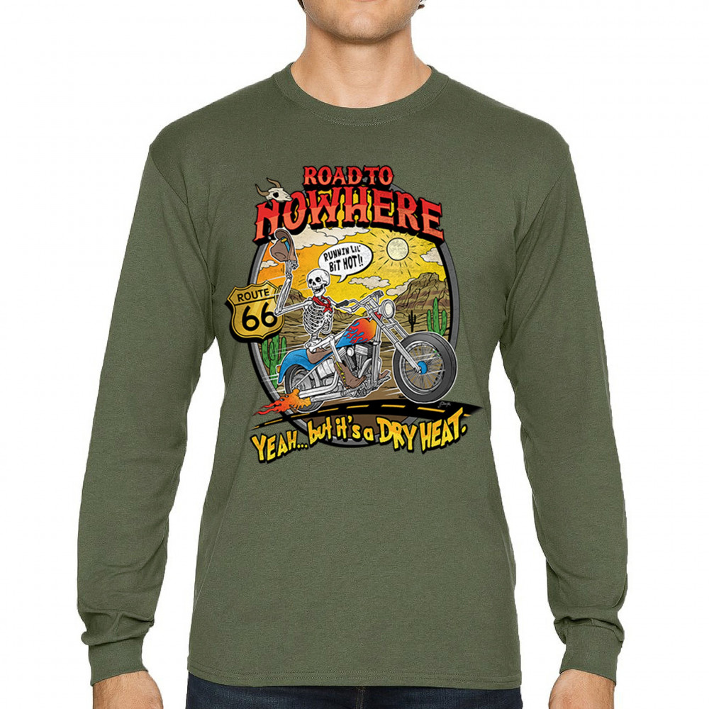 Discover the 'Road to Nowhere' T-shirt: a blend of bold graphics and adventurous spirit. Embrace the ride with our Route 66 skeleton biker design.