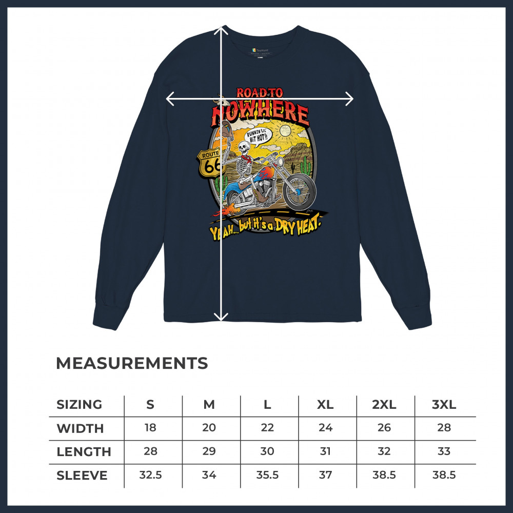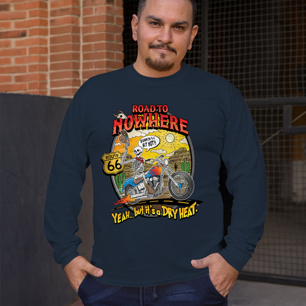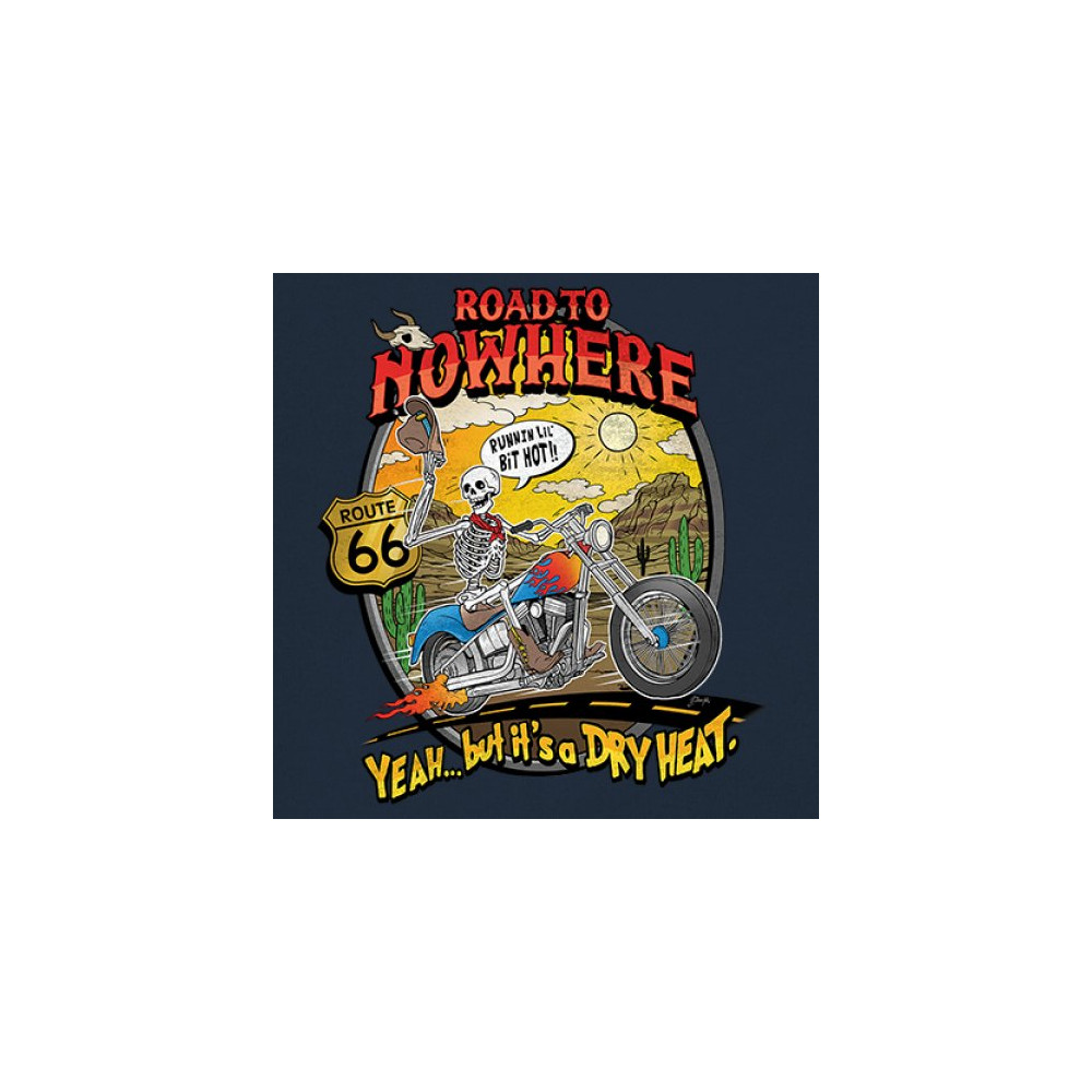 Our 'Road to Nowhere' tee is a salute to the thrill-seekers and the heat-bravers. Adorned with a bold skeleton cruising down Route 66, it embodies the spirit of adventure with a touch of playful defiance. A statement piece for anyone who lives for the ride and laughs in the face of danger. Join the ride into the sunset with this daring design.