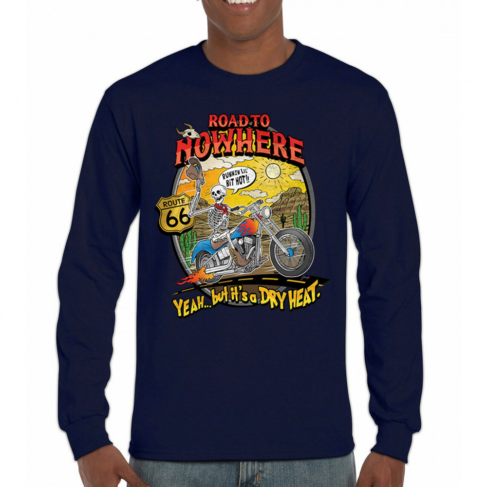 Discover the 'Road to Nowhere' T-shirt: a blend of bold graphics and adventurous spirit. Embrace the ride with our Route 66 skeleton biker design.