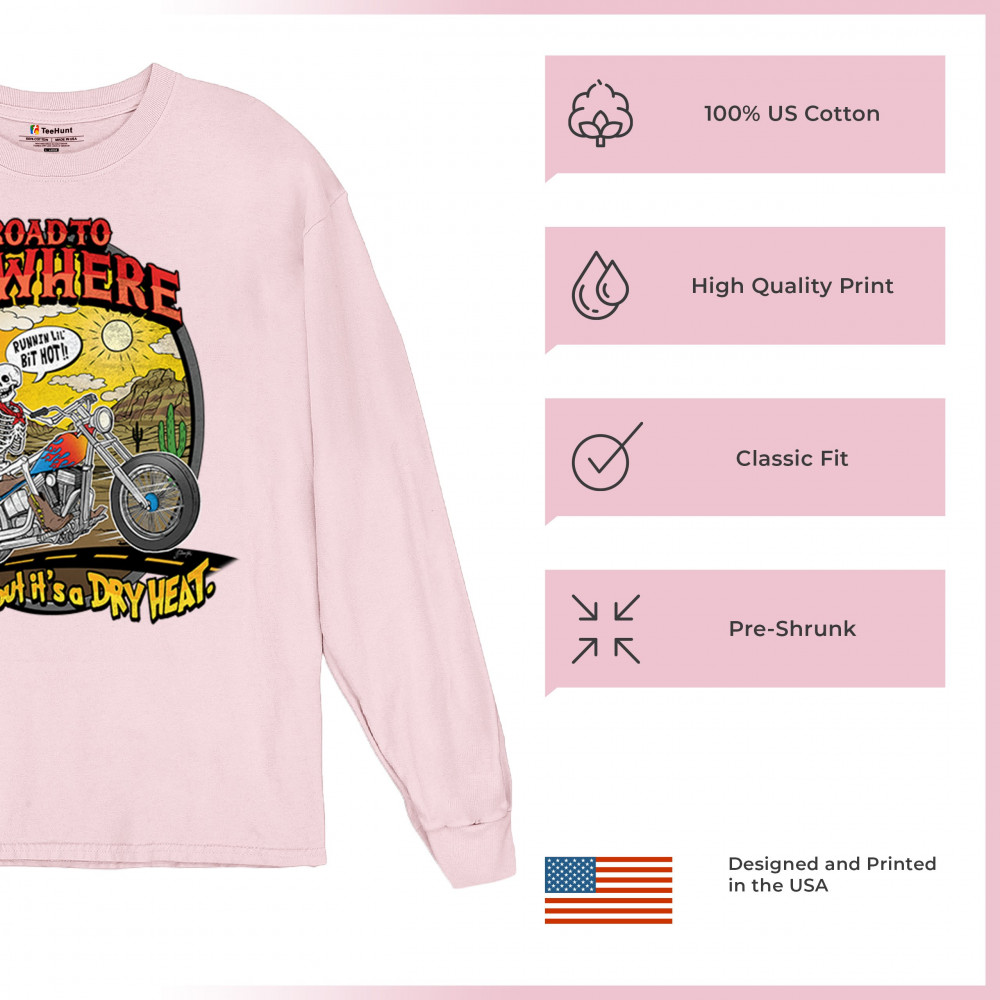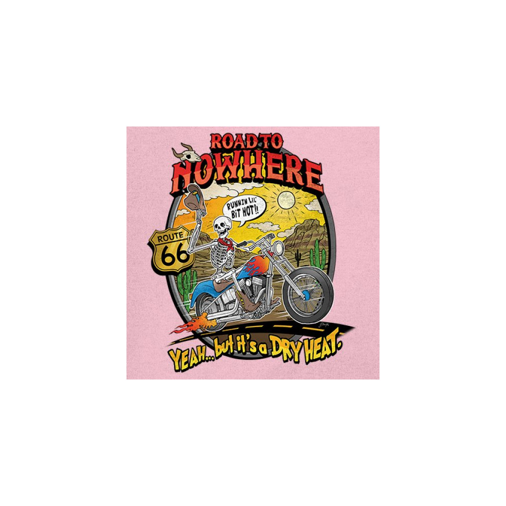 Our 'Road to Nowhere' tee is a salute to the thrill-seekers and the heat-bravers. Adorned with a bold skeleton cruising down Route 66, it embodies the spirit of adventure with a touch of playful defiance. A statement piece for anyone who lives for the ride and laughs in the face of danger. Join the ride into the sunset with this daring design.