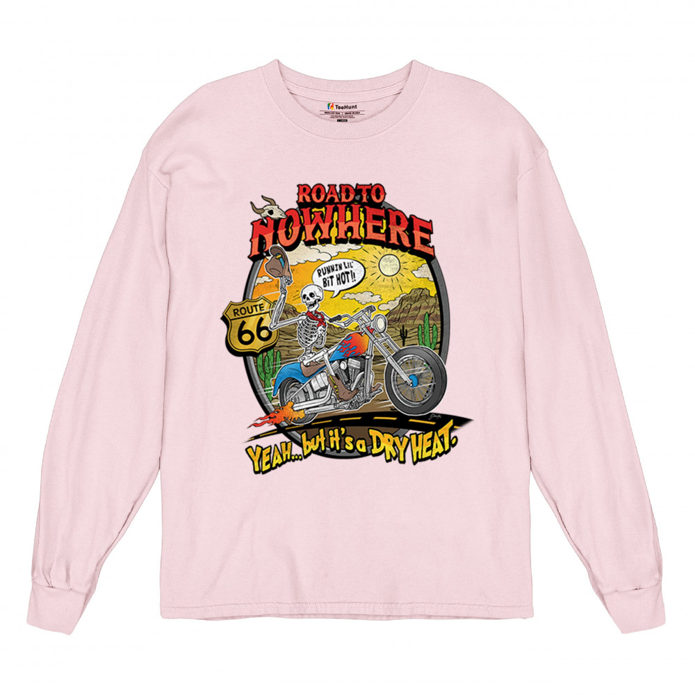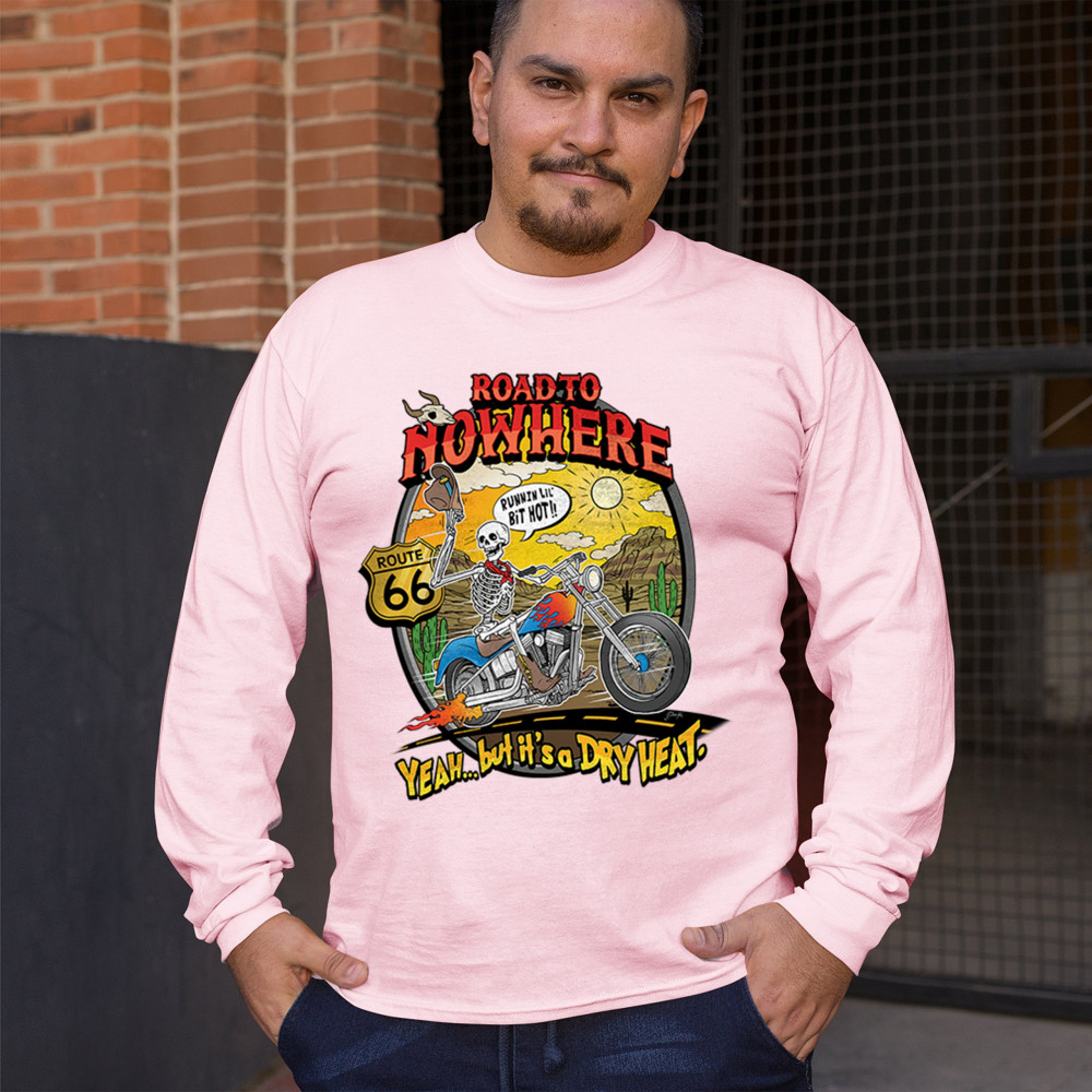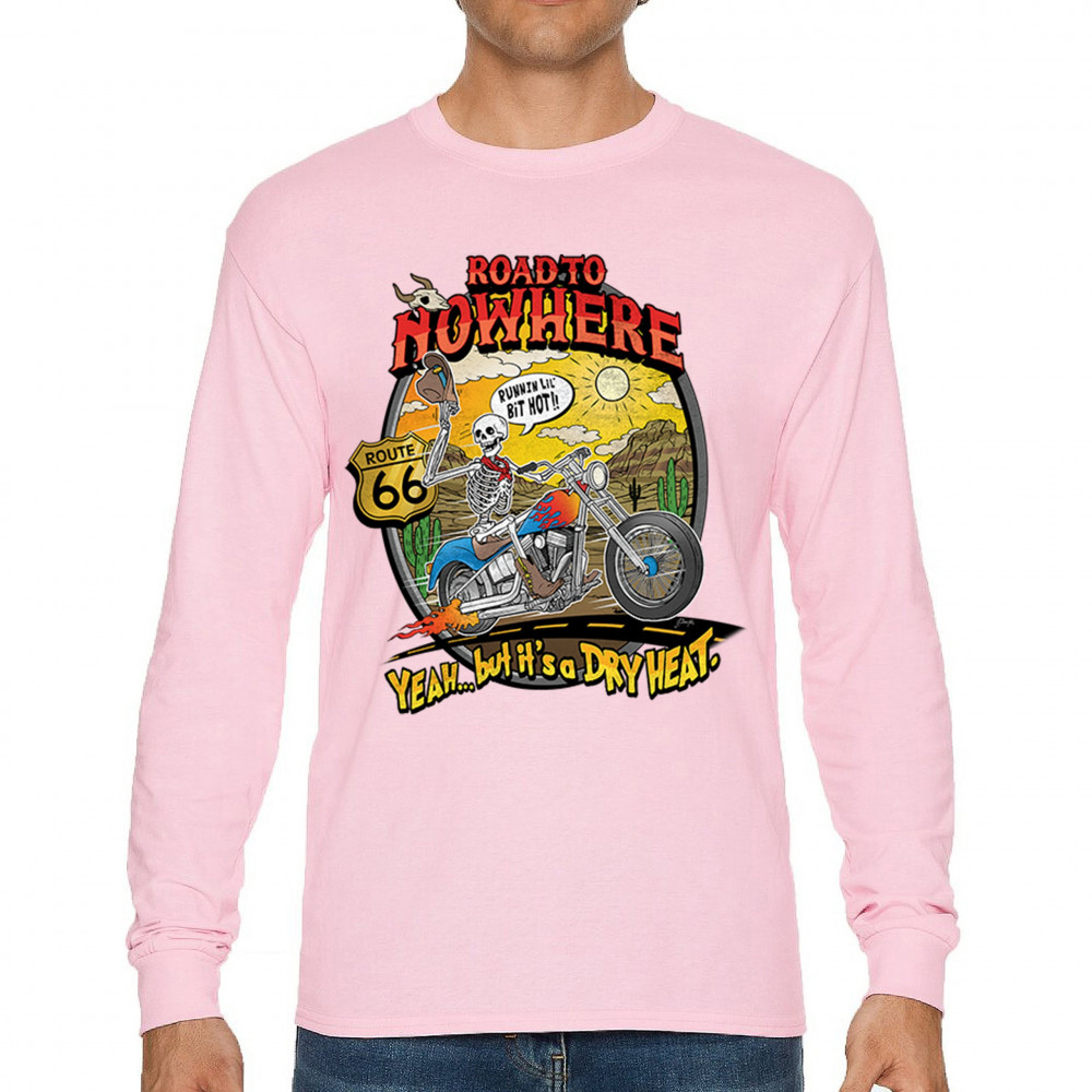 Discover the 'Road to Nowhere' T-shirt: a blend of bold graphics and adventurous spirit. Embrace the ride with our Route 66 skeleton biker design.