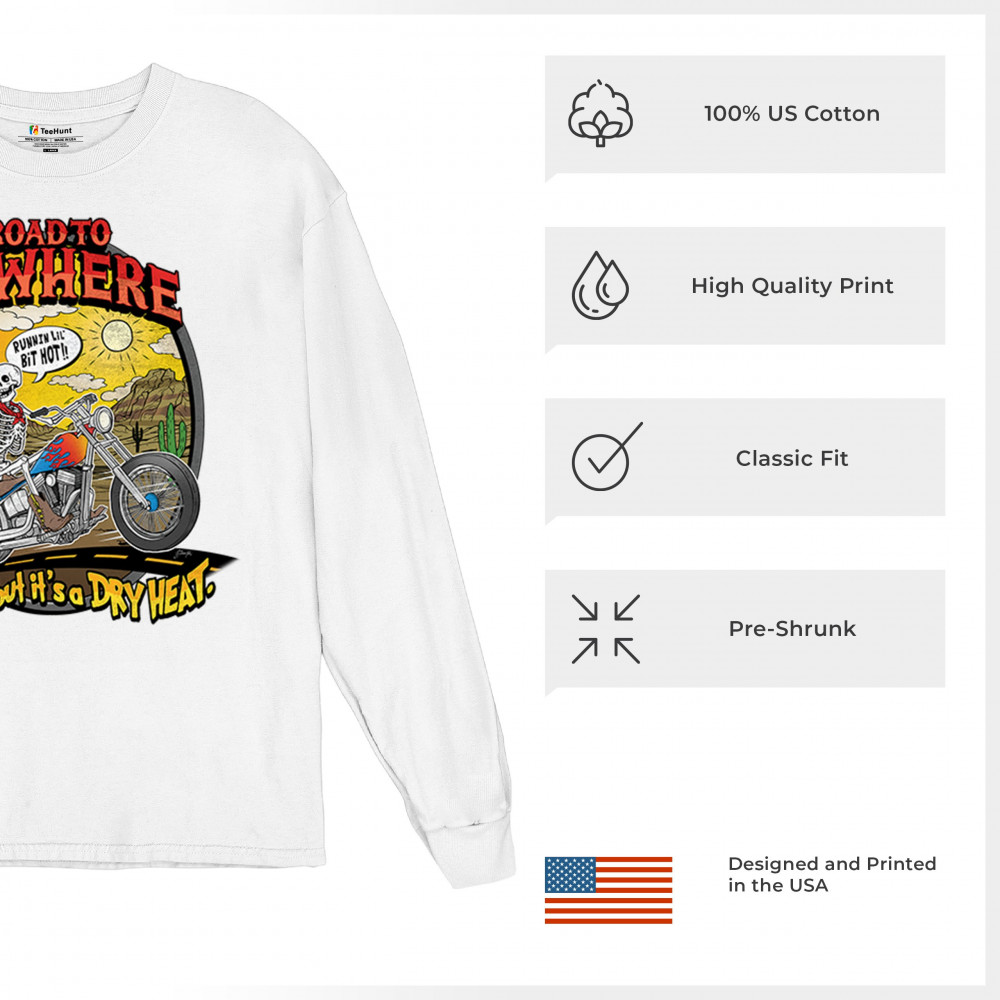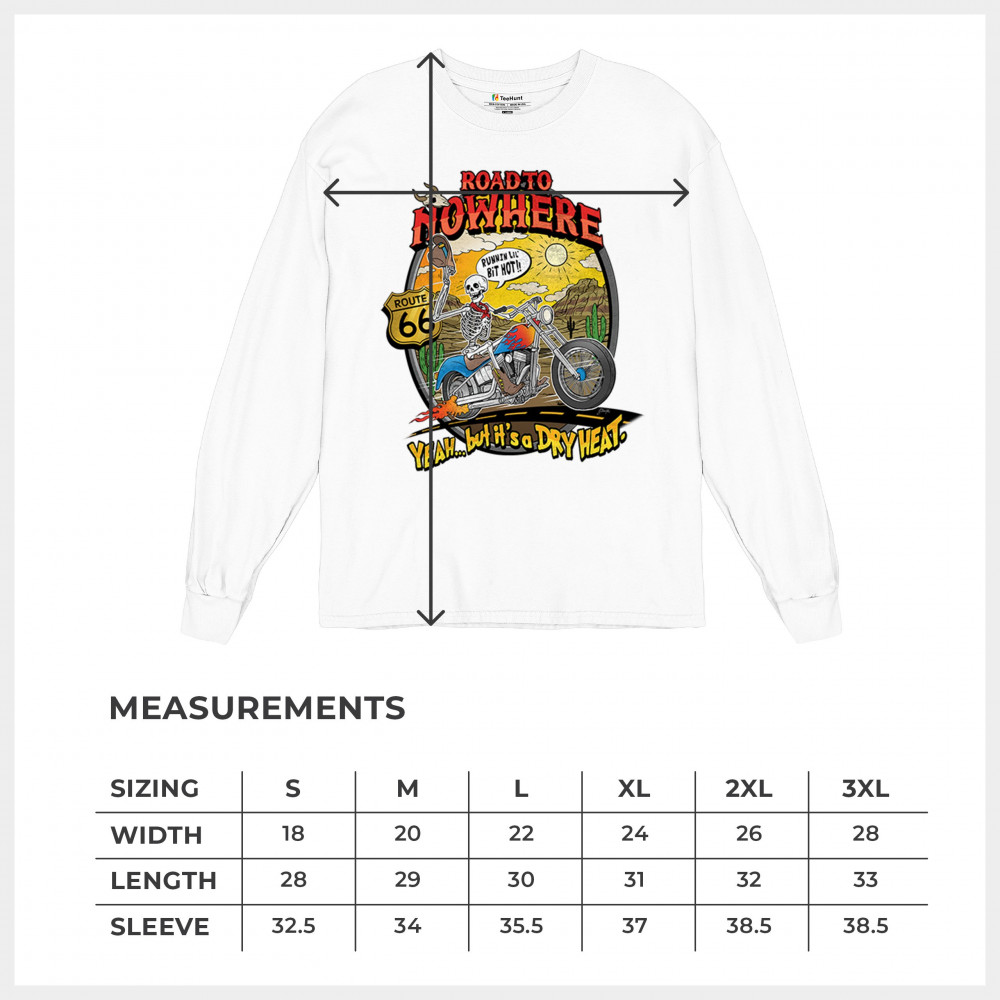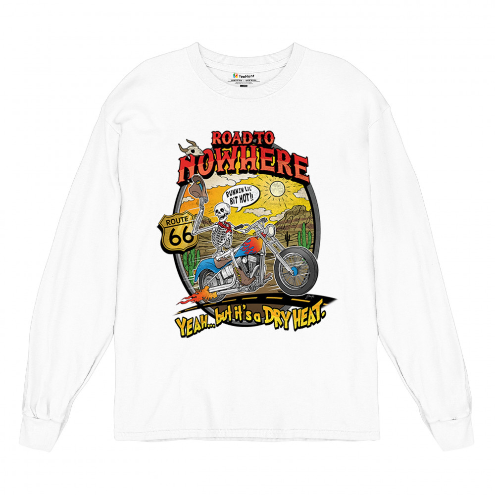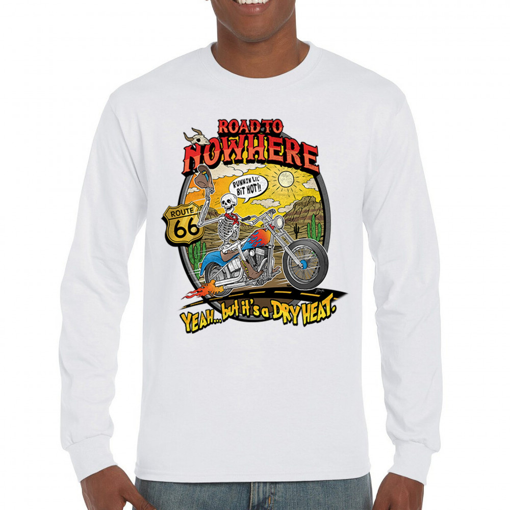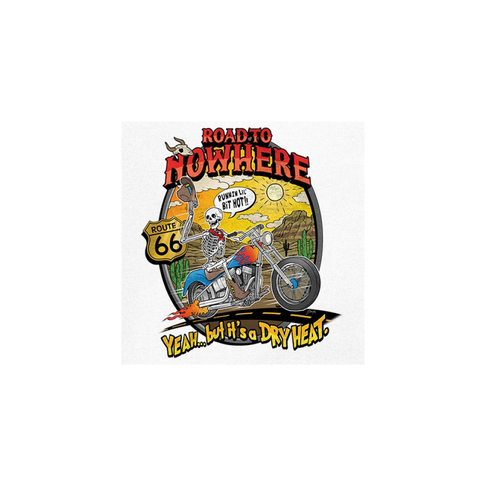 Discover the 'Road to Nowhere' T-shirt: a blend of bold graphics and adventurous spirit. Embrace the ride with our Route 66 skeleton biker design.