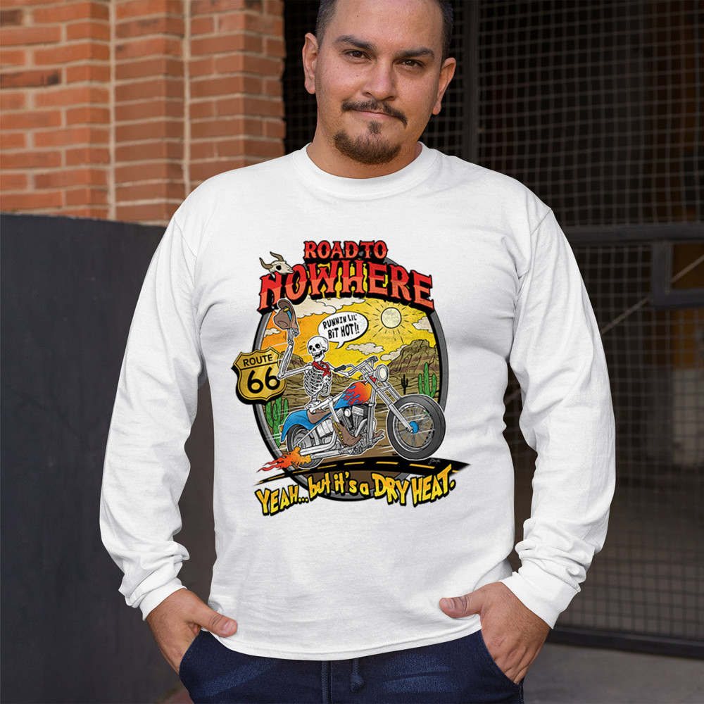 Our 'Road to Nowhere' tee is a salute to the thrill-seekers and the heat-bravers. Adorned with a bold skeleton cruising down Route 66, it embodies the spirit of adventure with a touch of playful defiance. A statement piece for anyone who lives for the ride and laughs in the face of danger. Join the ride into the sunset with this daring design.