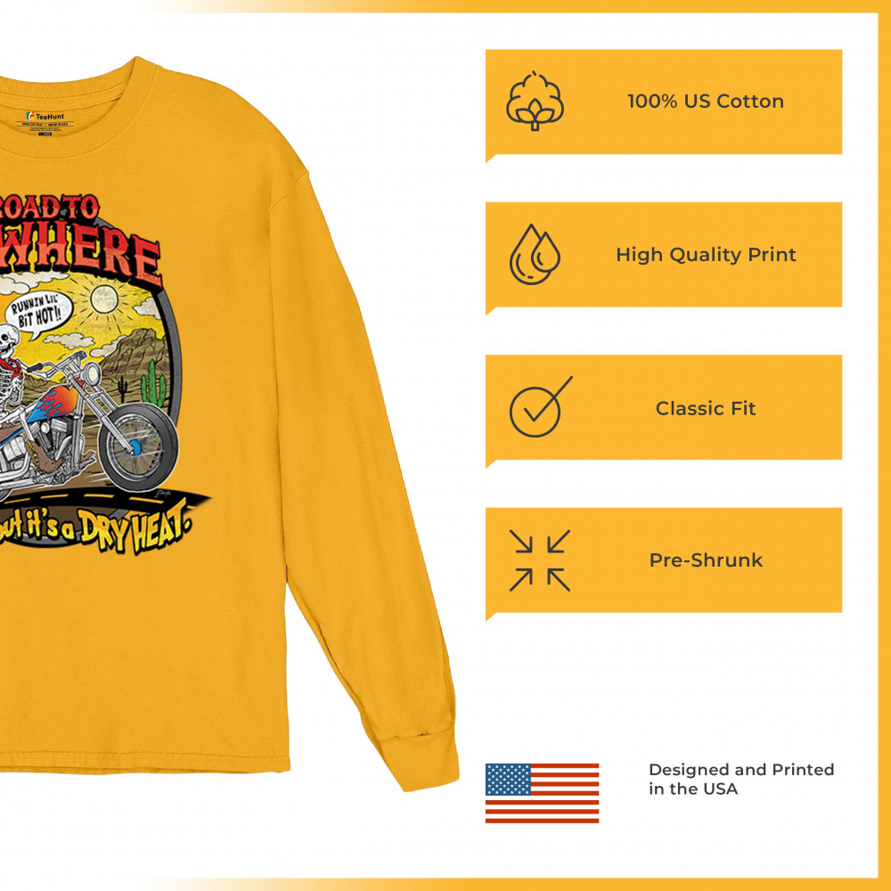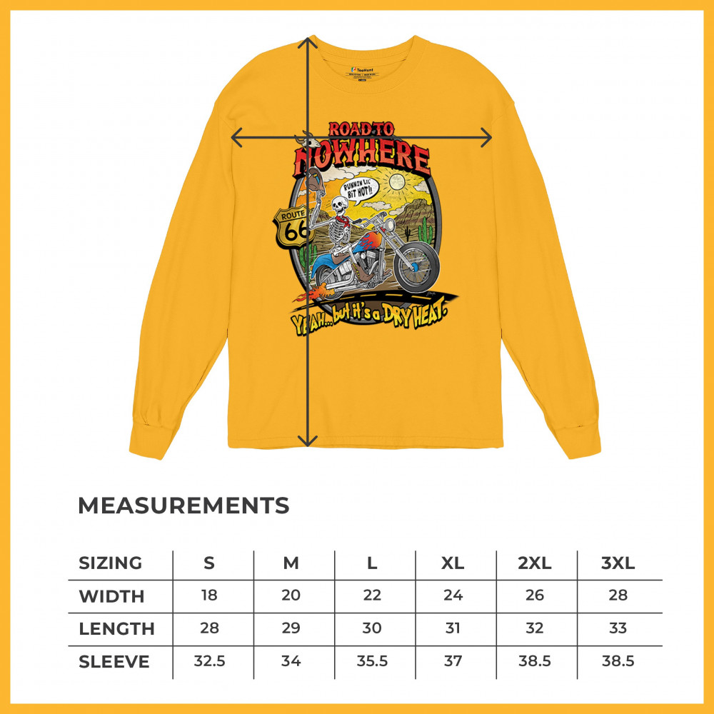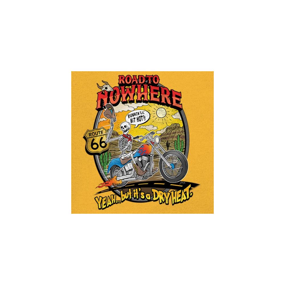 Our 'Road to Nowhere' tee is a salute to the thrill-seekers and the heat-bravers. Adorned with a bold skeleton cruising down Route 66, it embodies the spirit of adventure with a touch of playful defiance. A statement piece for anyone who lives for the ride and laughs in the face of danger. Join the ride into the sunset with this daring design.