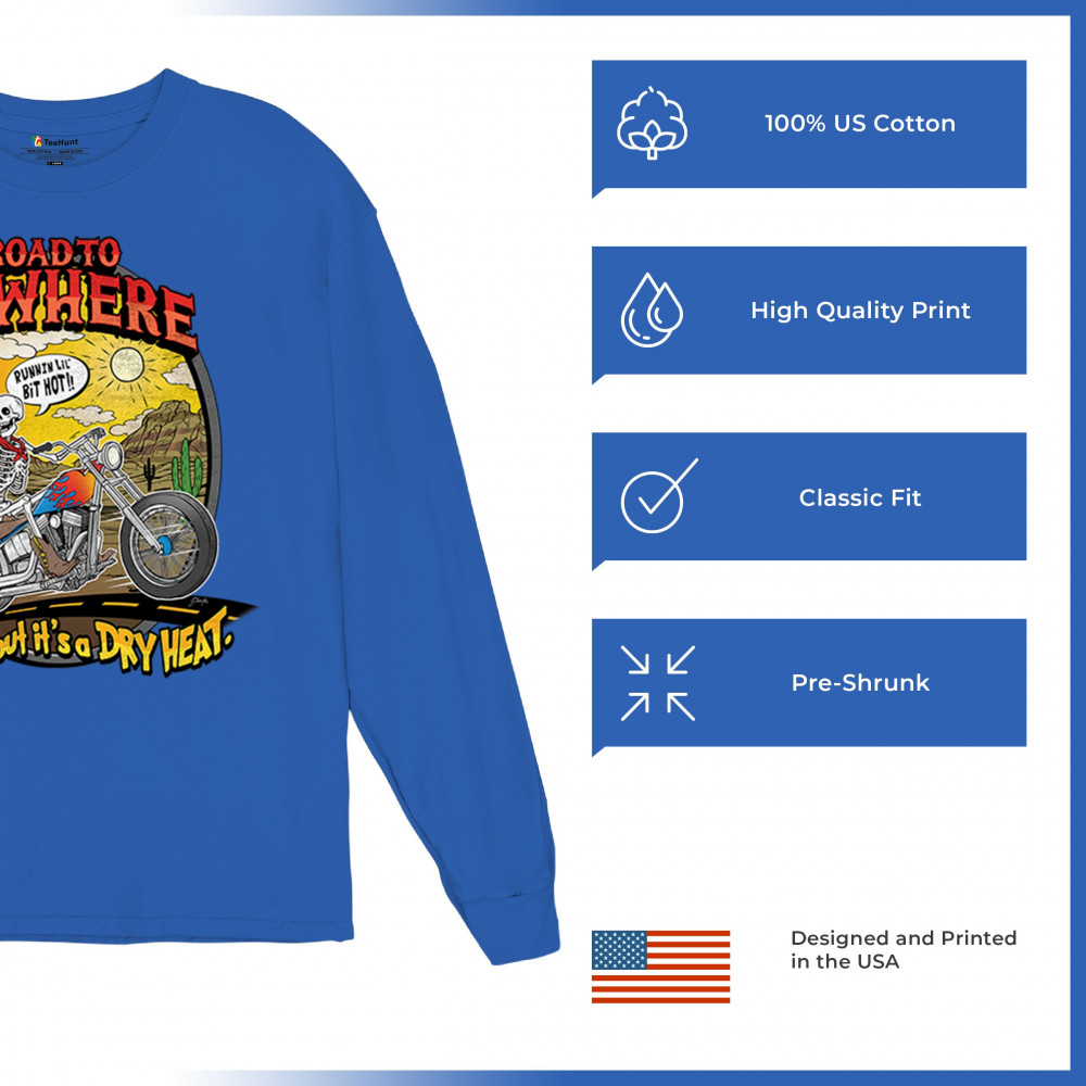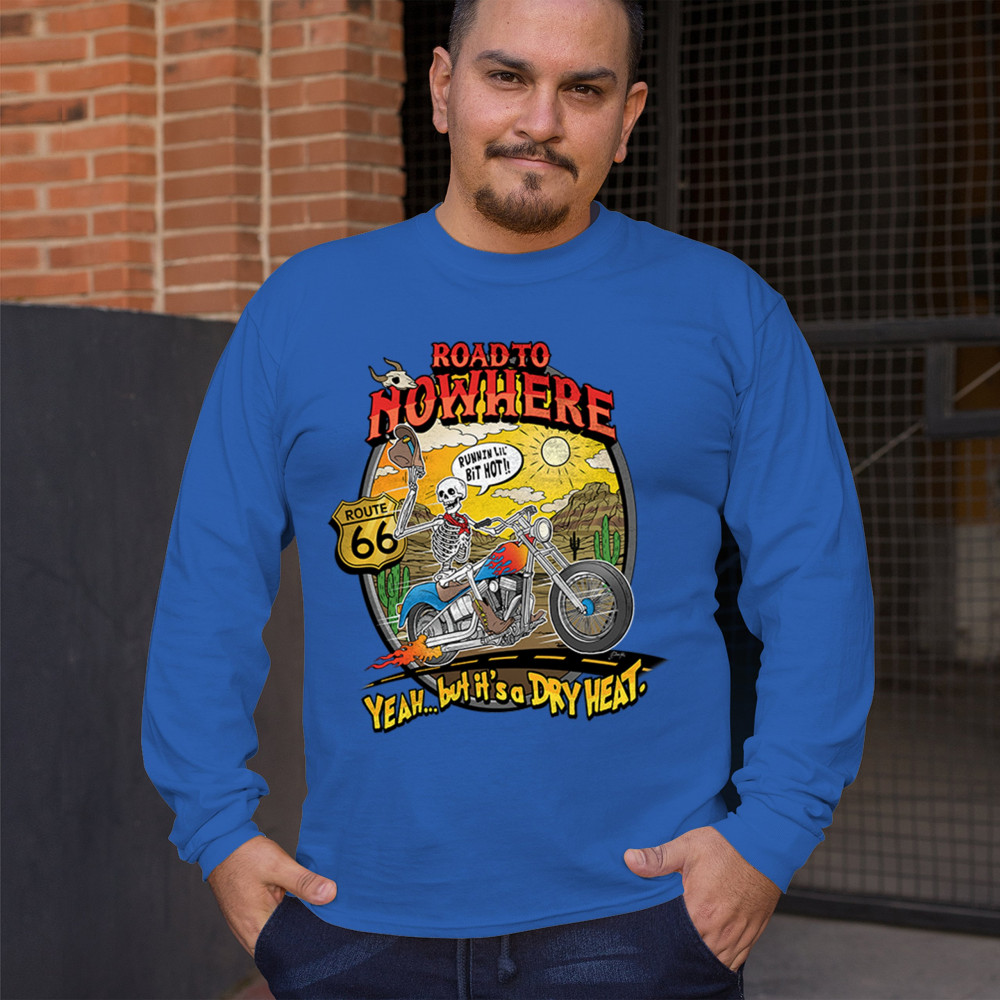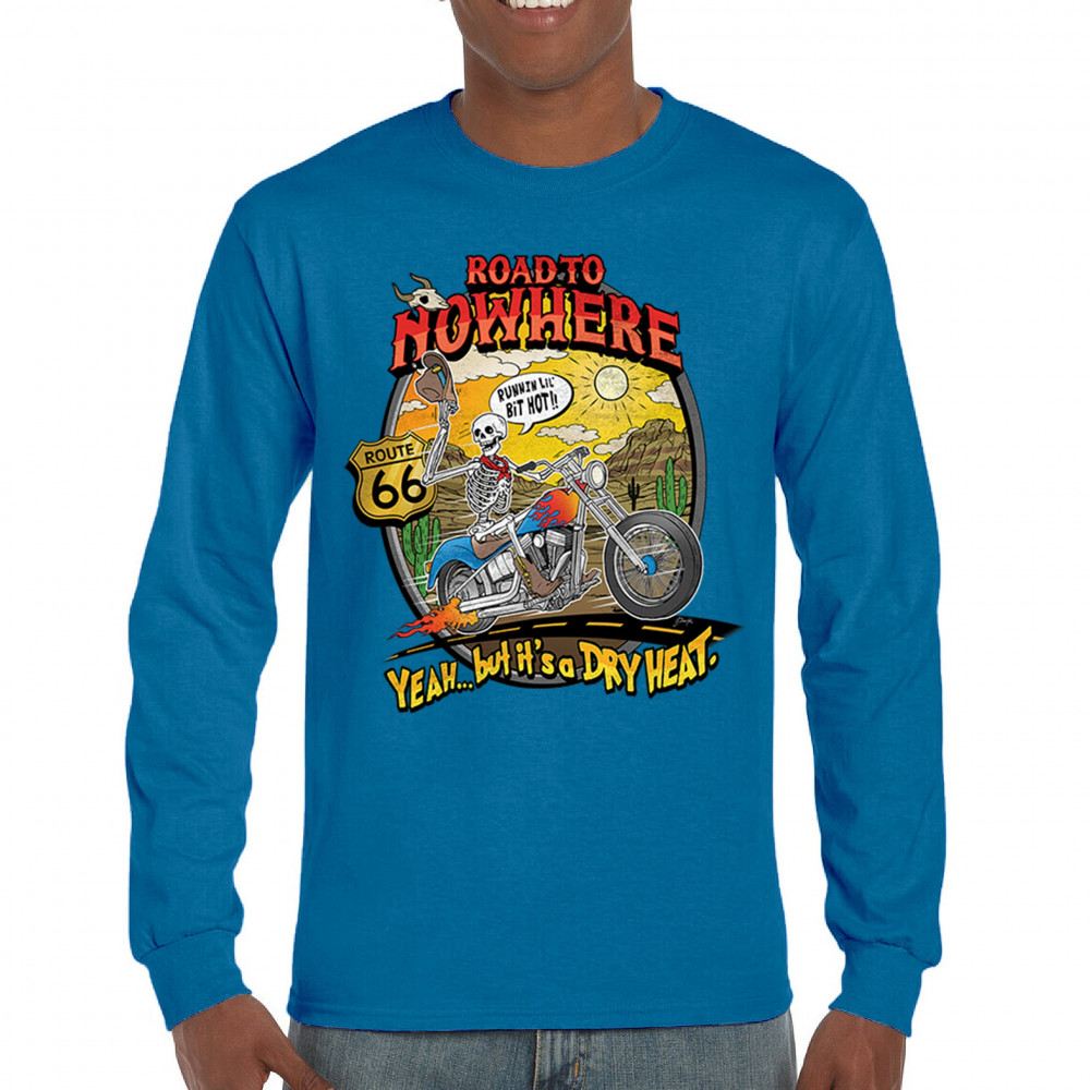 Discover the 'Road to Nowhere' T-shirt: a blend of bold graphics and adventurous spirit. Embrace the ride with our Route 66 skeleton biker design.