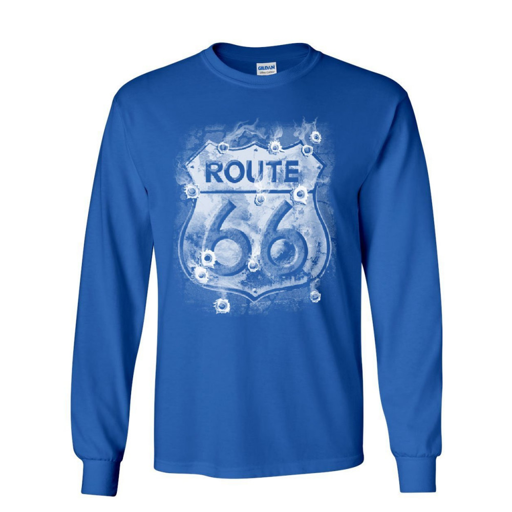 ROUTE 66 SIGN WITH BULLET HOLES route 66 long sleeve t-shirt bullet holes the mother road american highway tee royal blue