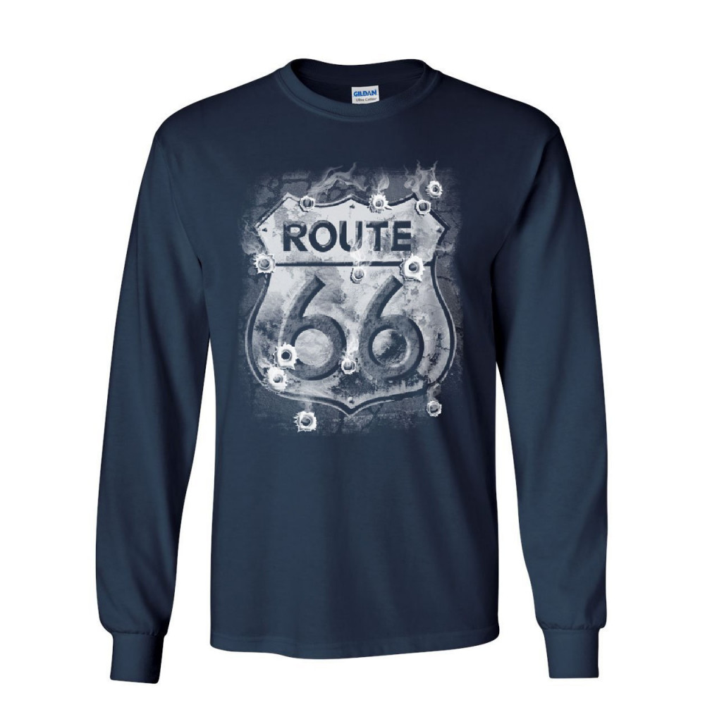 ROUTE 66 SIGN WITH BULLET HOLES route 66 long sleeve t-shirt bullet holes the mother road american highway tee navy blue