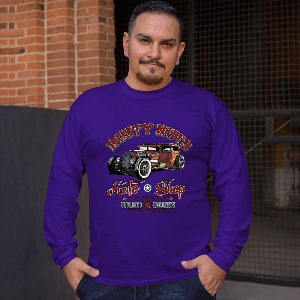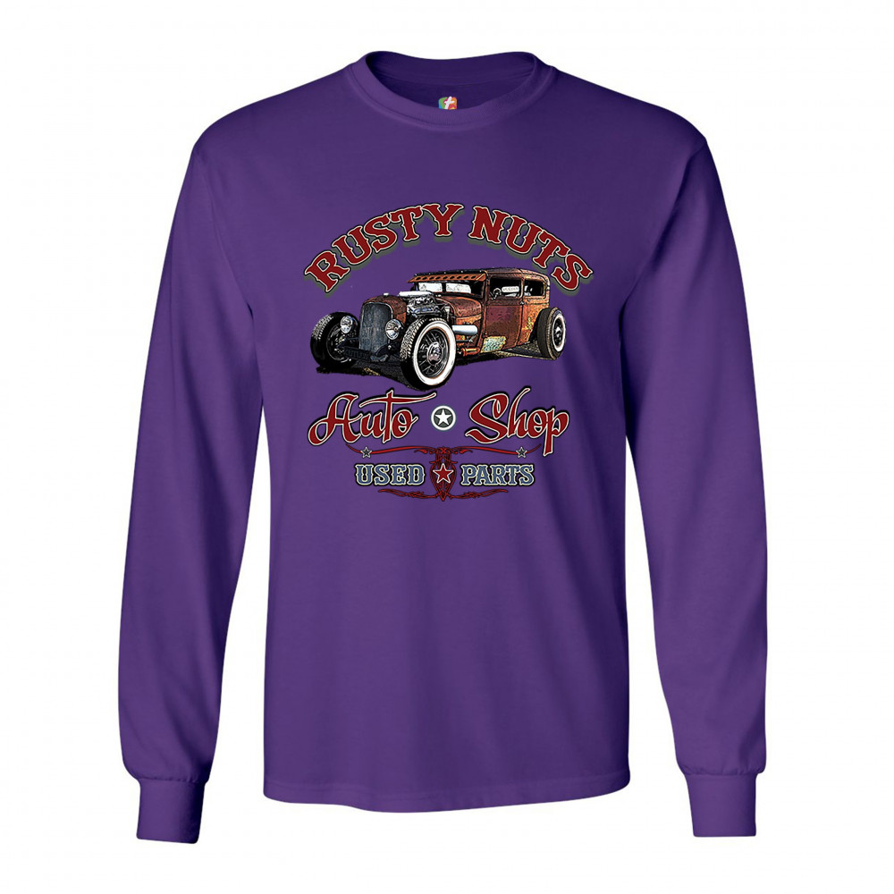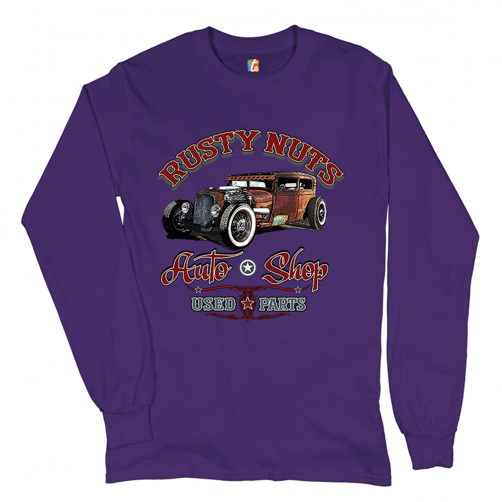 RUSTY NUTS AUTO SHOP long sleeve t-shirt hot rod rat rod vintage old school purple